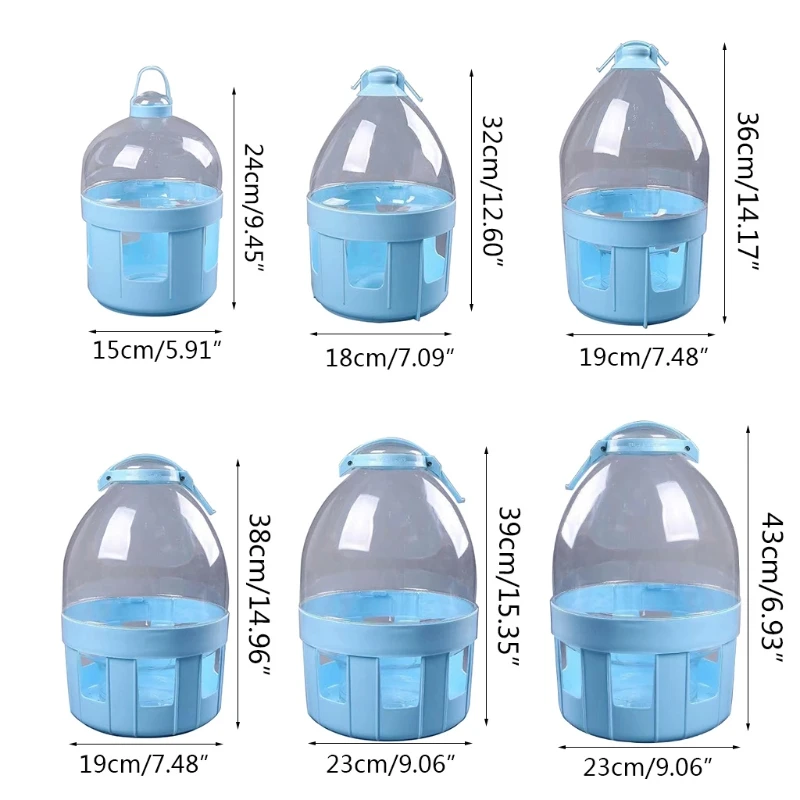 Nous offrons 6 tailles de buveur d’eau d’oiseau pour satisfaire différents besoins. 2L mesure environ 15x15x24 cm/5.9 « x 5.9 » x 9.5 « , 4L est 18x18x32 cm/7.1 » x 7.1 « x 12.6 », 6L est 19x19x36 cm/7.5 « x 7.5 » x 14.2 « , 8L est 19x19x38 cm/7.5 » x 7.5 « x 15 », 10L est 23x23x39 cm/9.1 « x 9.1 » x 15.4 « , 12L est 23x23x43 cm/9.1 » x 9.1 « x 17 ».