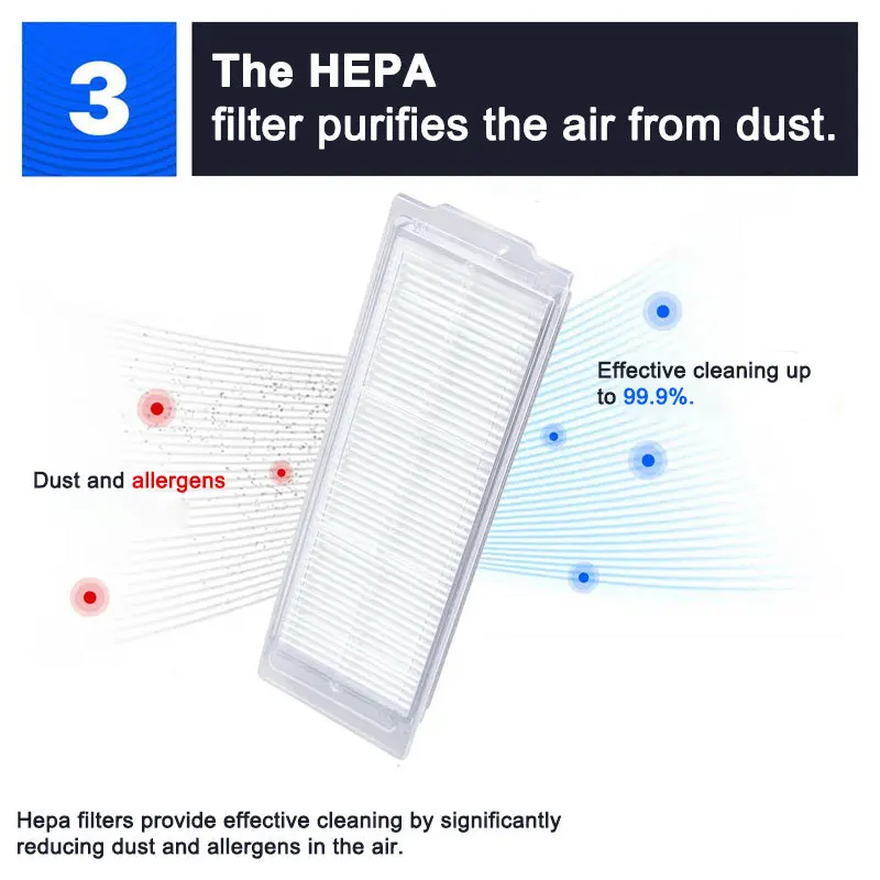 Les accessoires sont conçus pour maintenir votre robot domestique au meilleur rendement. Les brosses latérales sont faciles à remplacer et les filtres maintiennent l’efficacité de nettoyage du robot tout en réduisant la pénétration de poussière, de pollen et d’autres allergènes dans l’air que vous respirez. Ils doivent être remplacés tous les 2 à 3 mois pour de meilleurs résultats. Les accessoires sont de haute qualité, faits de matériaux résistants et respectueux de l’environnement. Ils sont également faciles à utiliser pour enlever la saleté, la poussière et les déchets dans les coins et les bords, y compris les cheveux humains et animaux. Enfin, les pièces d’accessoires sont durables et simples à installer, ce qui contribue à prolonger la durée de vie de votre robot aspirateur.