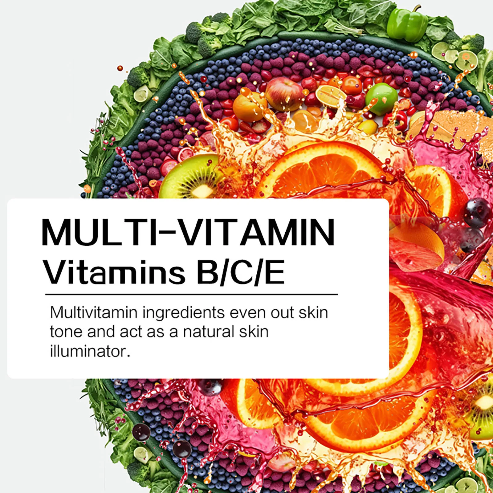 Les ingrédients de multivitamines unifient le teint et agissent comme un illuminateur naturel de la peau