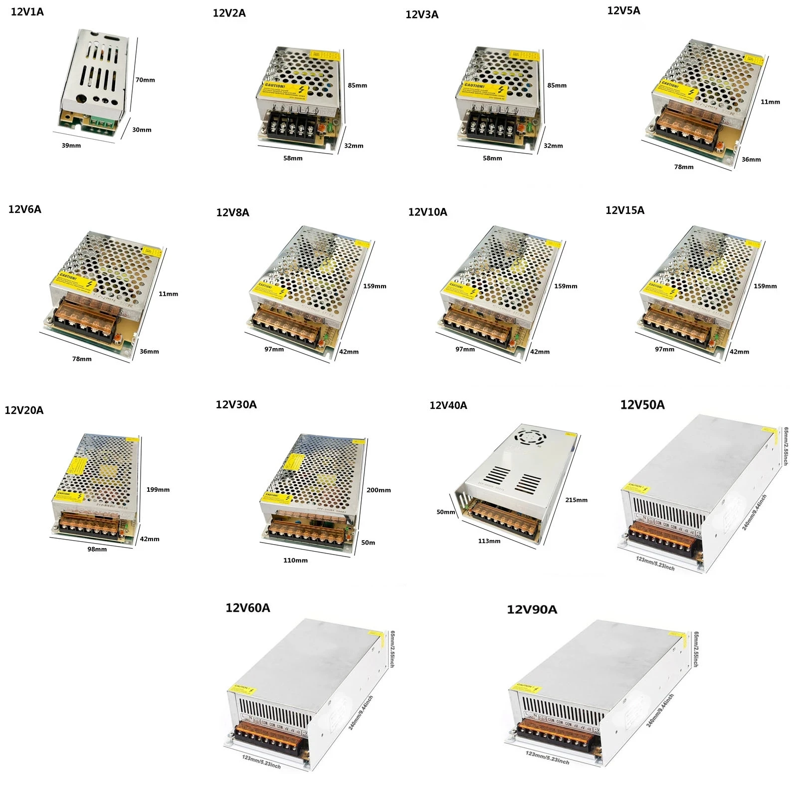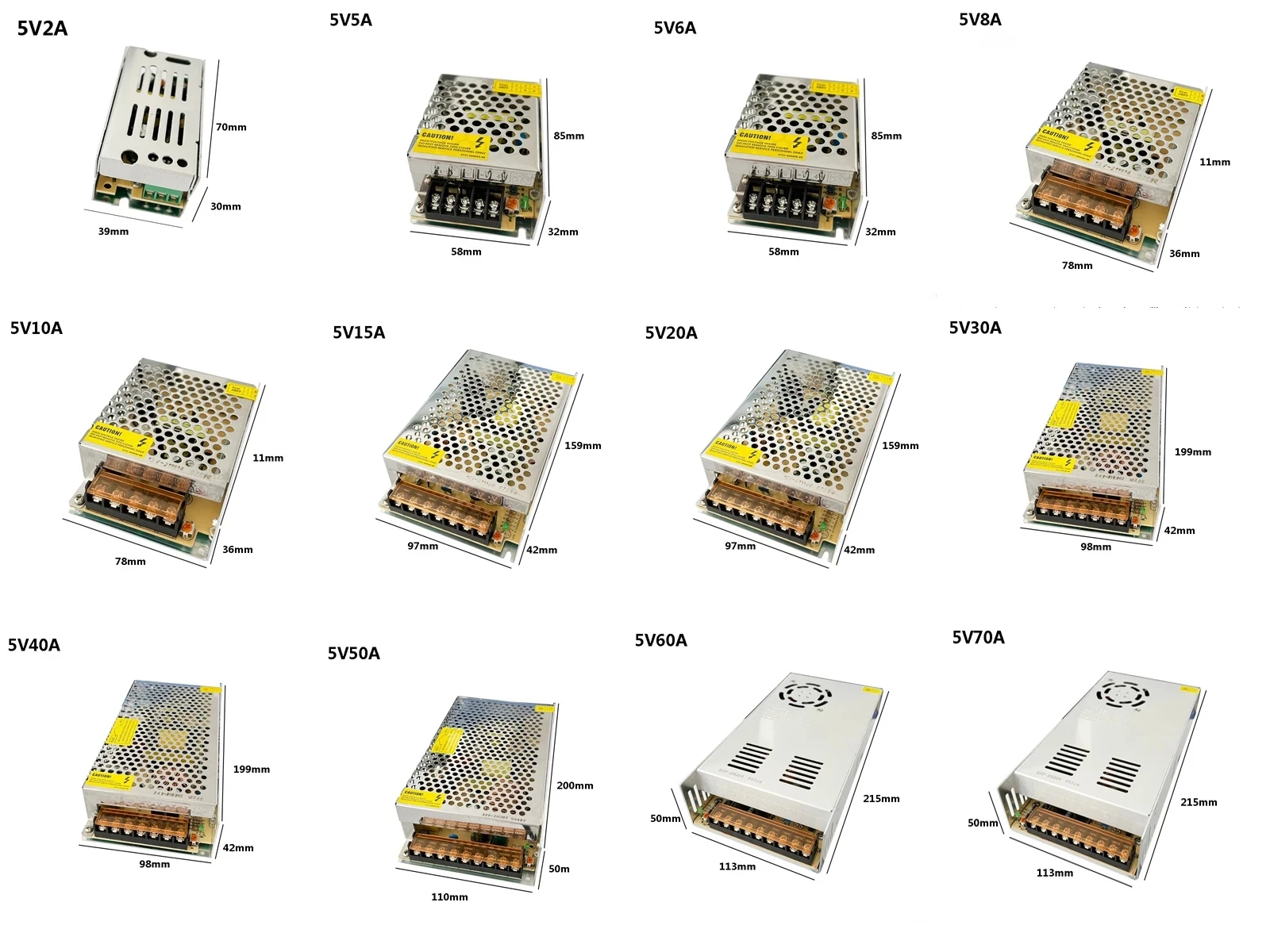 - Sortie: DC5V / 2A 6A 10A 15A 20A 30A 40A 50A 60A 72A; DC12V / 2A 3A 5A 8A 10A 12.5A 15A 20A 30A 40A 50A 60A; DC 24V / 1A 2A 3A 5A 10A 15A 20A 30A 33A
