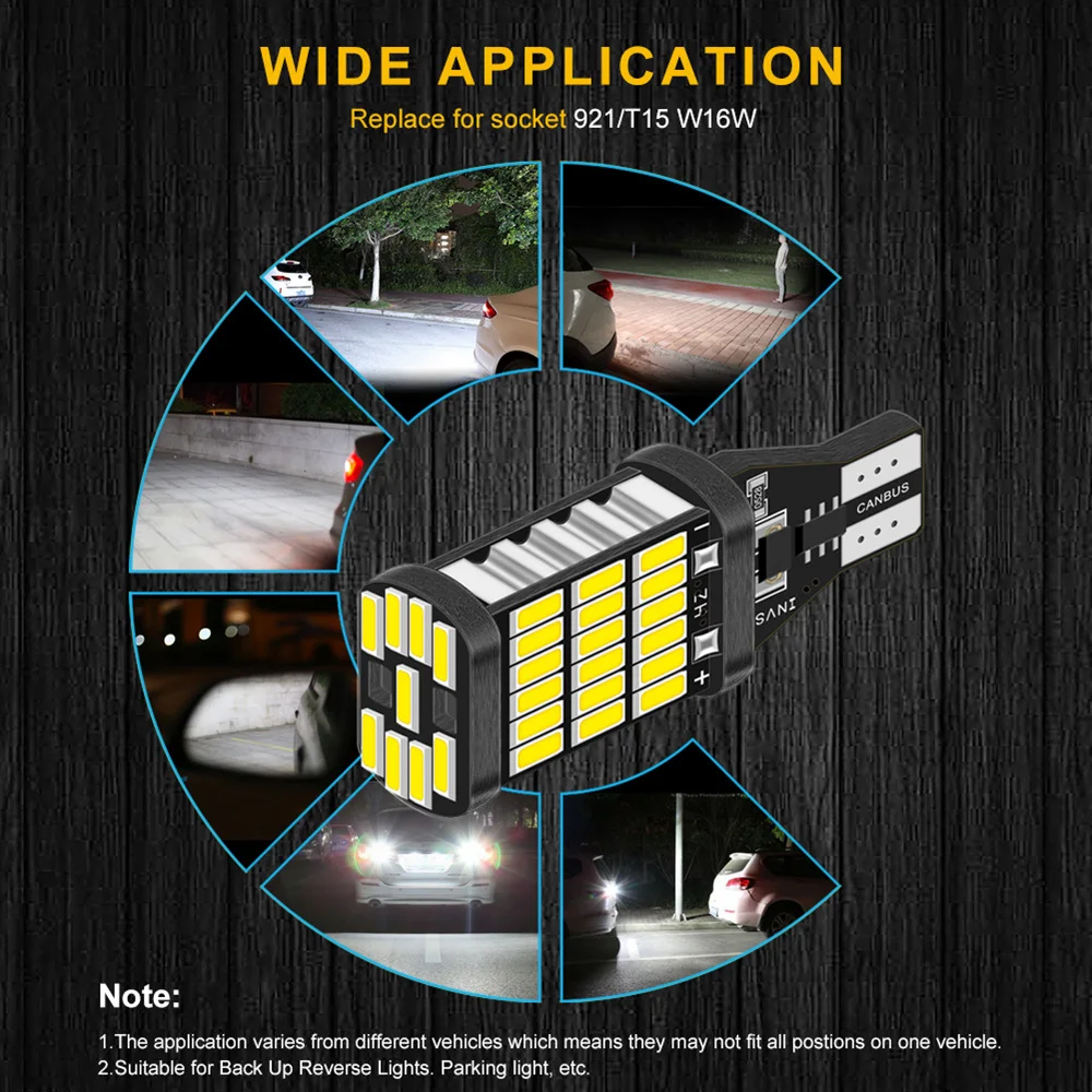 Les ampoules LED Canbus T15 W16W sont équipées de 45 pièces de la puce 4014SMD, ce qui garantit une super luminosité d’environ 1200Lm. Elles sont également dotées d’une conception sans erreur Canbus et sont compatibles avec le type de prise standard W16W.