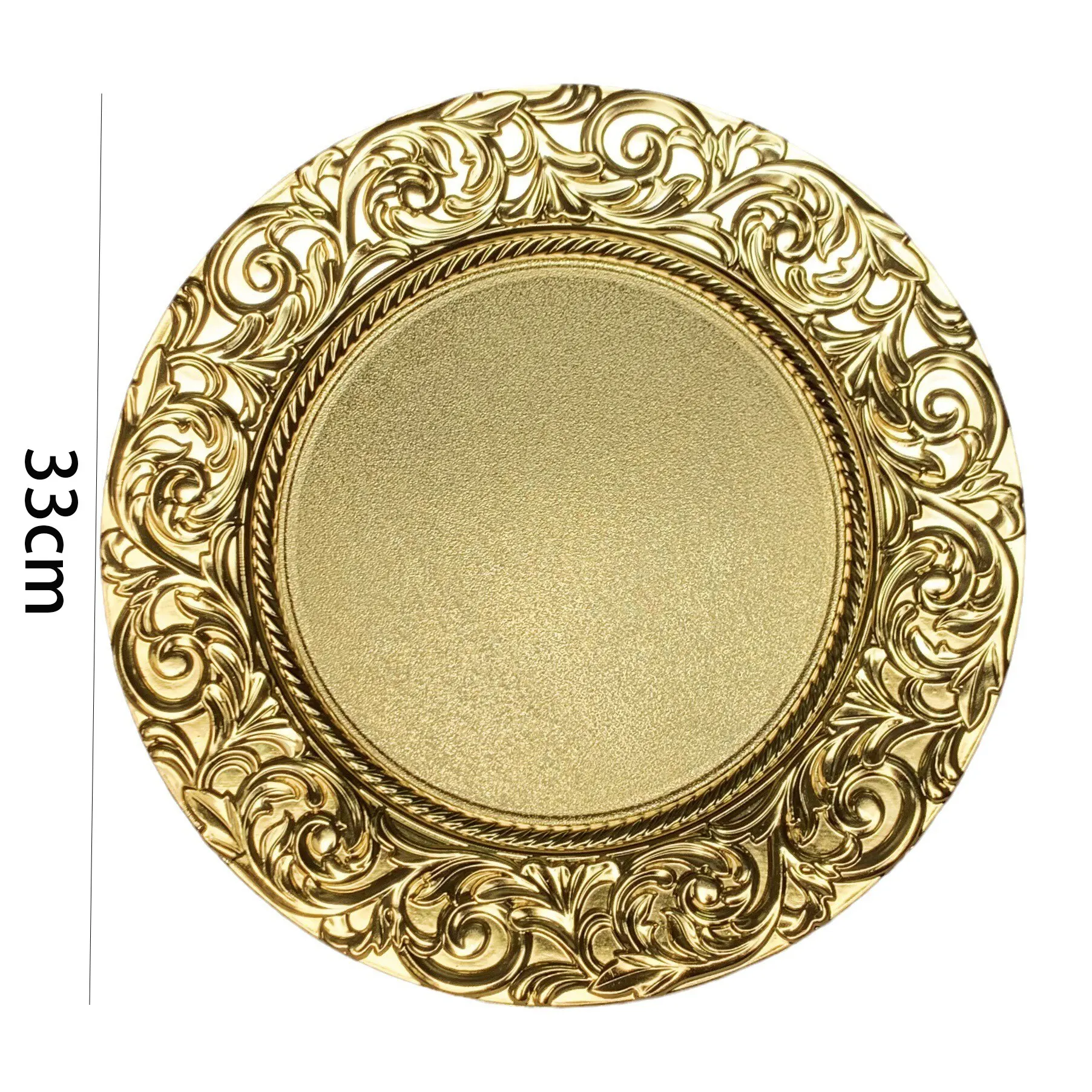 Les assiettes de chargeur en plastique doré ont un diamètre de 33 cm/13 pouces.