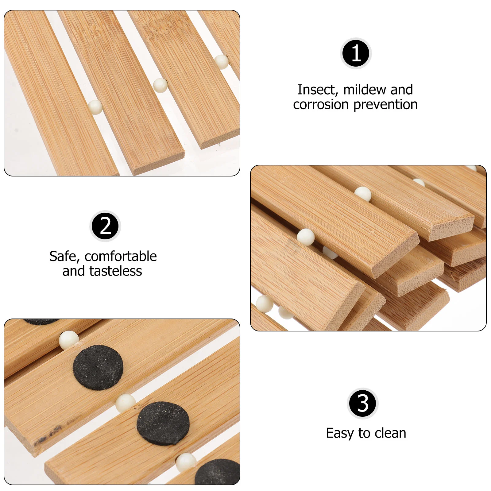 | Matériel | Tapis de sol en bambou naturel avec revêtement résistant à l’eau et bordure en tissu. |