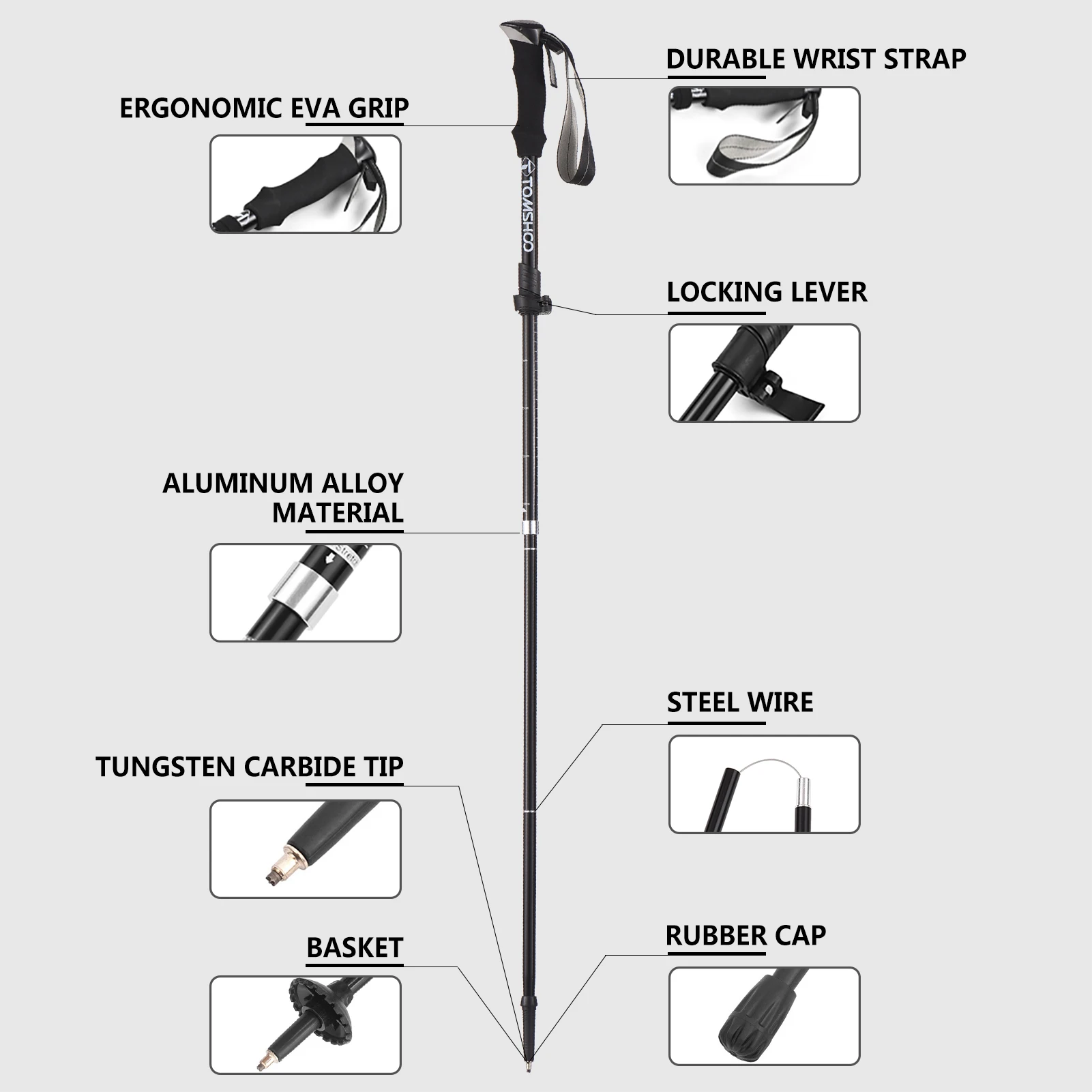Les bâtons d’escalade légers pliables Tomshoo sont fabriqués en alliage d’aluminium, ce qui les rend à la fois légers et durables. Ils peuvent supporter un poids maximal de 100 kg. Ces bâtons sont facilement réglables de 110 cm à 130 cm, ce qui les rend adaptés à la taille de l’utilisateur, qu’il mesure entre 173 et 198 cm. La poignée ergonomique en EVA offre un confort optimal lors de la marche. De plus, ces bâtons sont équipés d’une dragonne qui offre une sécurité accrue et une meilleure manipulation. La pointe en carbure de tungstène est dotée de capuchons en caoutchouc et de paniers, ce qui les rend adaptés à une utilisation sur les sentiers enneigés ou boueux. Enfin, ces bâtons se décomposent à 36 cm, ce qui facilite leur rangement et leur transport. Ils ne pèsent que 265 g.