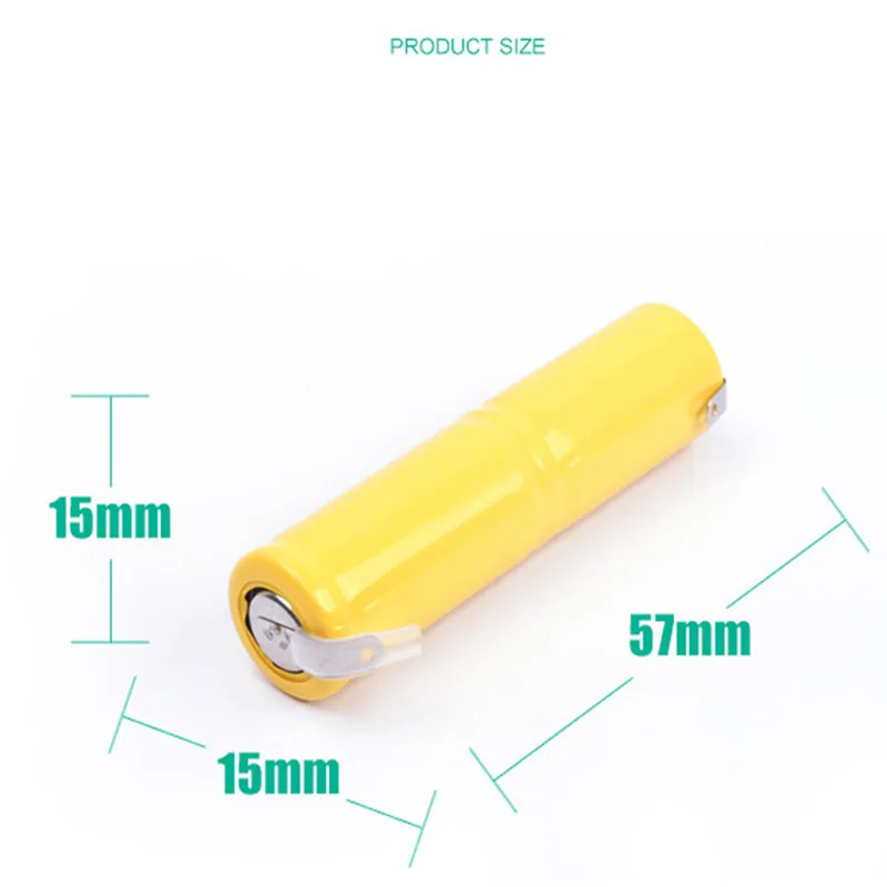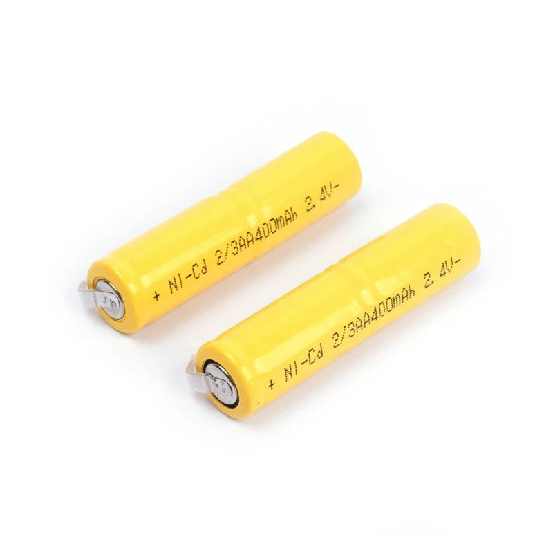 | batterie NI-CD 2/3AA | 400mAh | 2.4V | 1.5h | lampe à LED, voiture télécommandée, rasoir, etc. | 57x15x15mm |