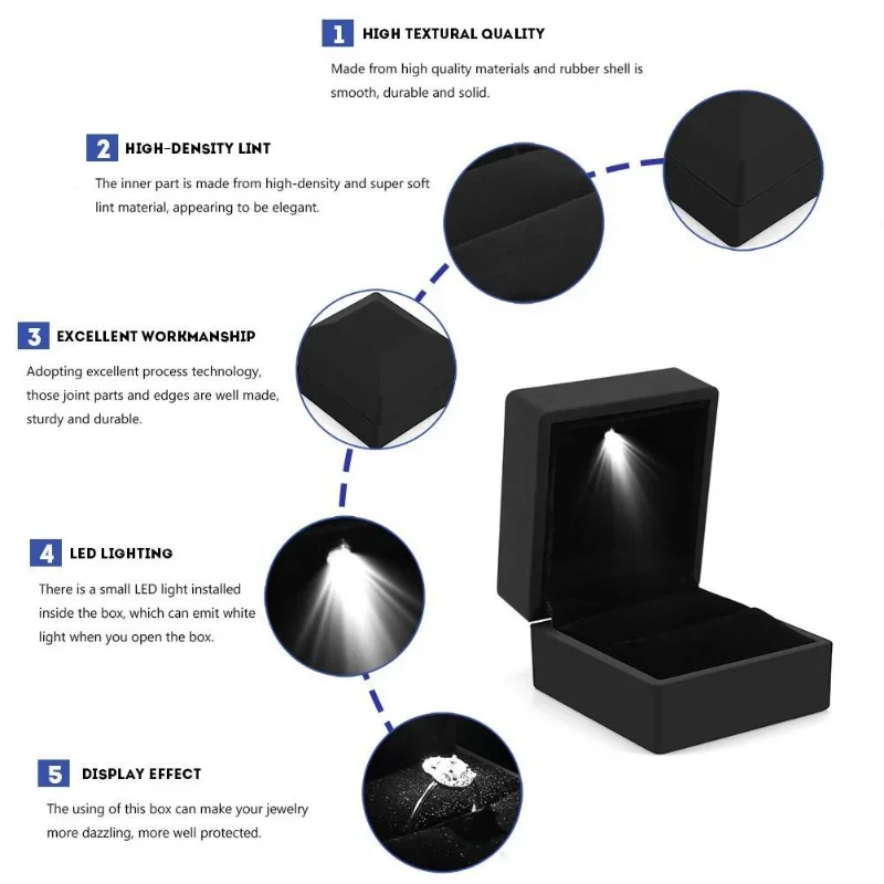 Conçue spécifiquement pour les bagues de fiançailles/mariage, etc., la boîte à bijoux avec lumière est fabriquée à partir de matériaux de haute qualité. La coque est lisse, durable et solide. Le tissu en peluche noire met en valeur la noblesse et l’élégance de la bague, et protège également votre bague tout en la rendant plus belle.