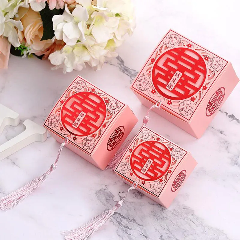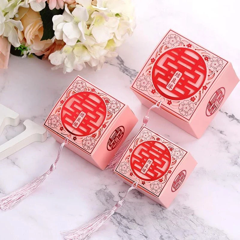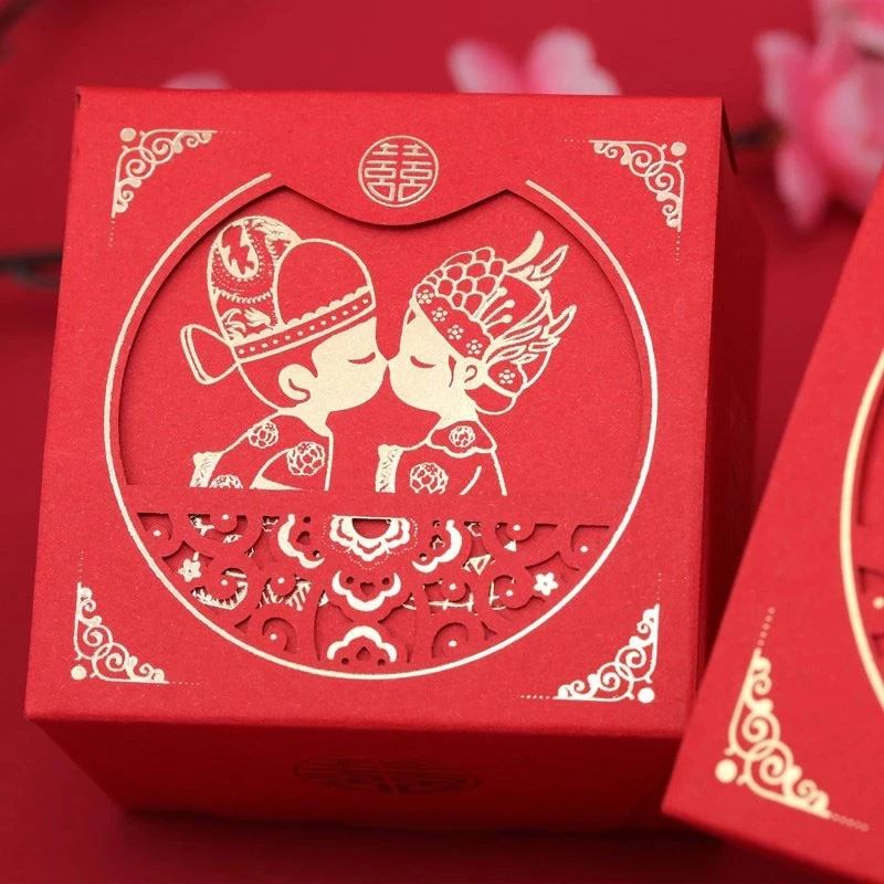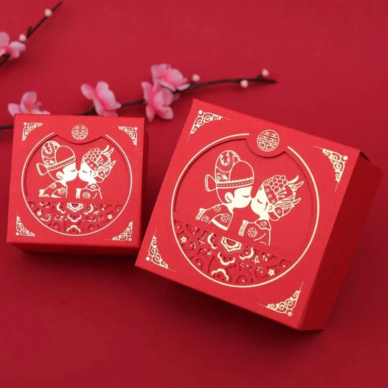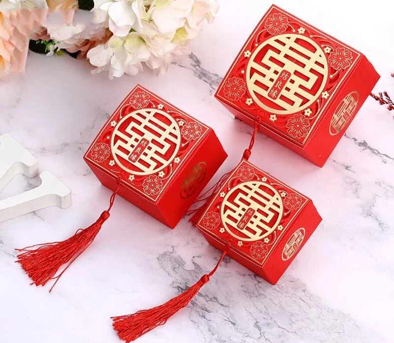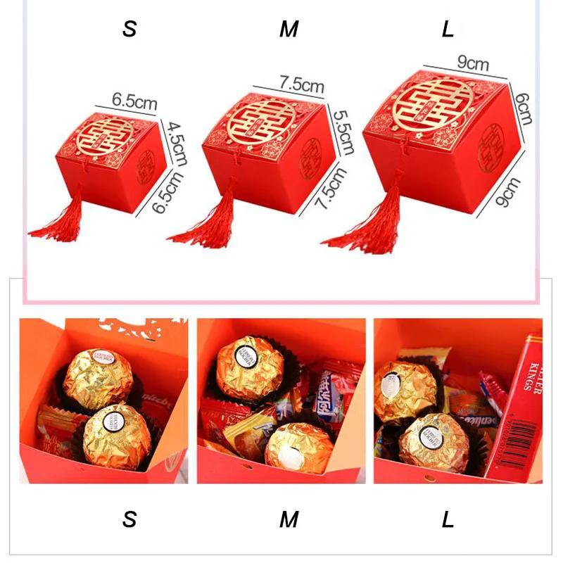 Le motif « Double bonheur » sur les boîtes représente une bénédiction de bonheur et de prospérité pour les jeunes mariés. Ces boîtes sont spécialement conçues pour emballer des bonbons ou des petits cadeaux pour les invités, et peuvent être assemblées facilement grâce à un processus de bricolage.