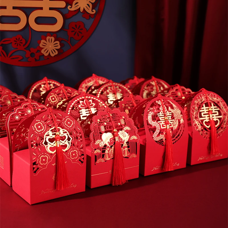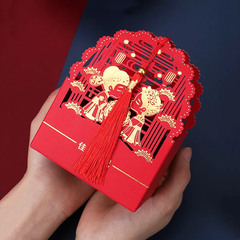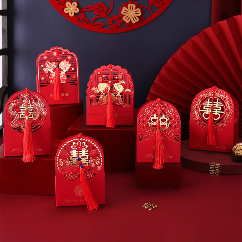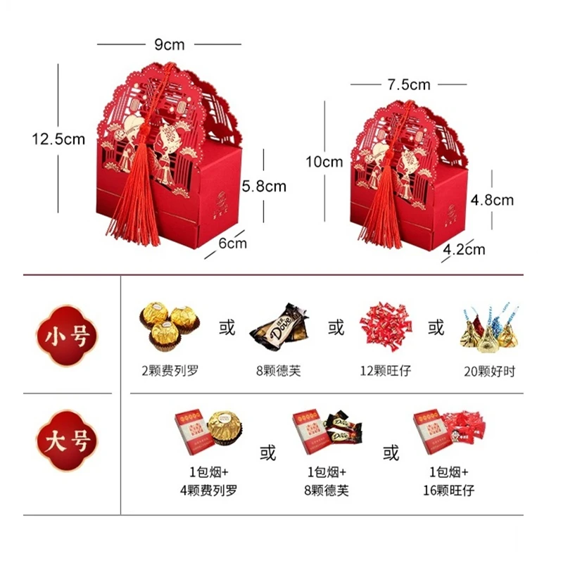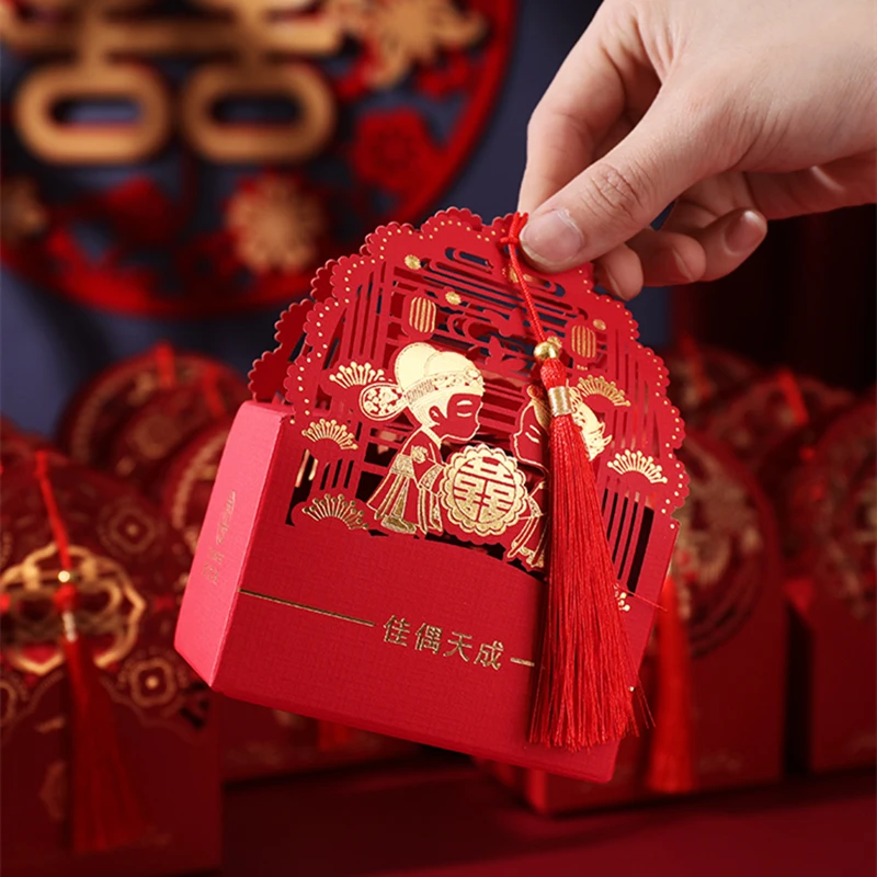 La Grande Boîte à Bonbons Rouge avec Glands pour Mariage Chinois est un choix idéal comme cadeau de mariage ou pour la décoration de fiançailles traditionnelles. La quantité de 50 pièces convient parfaitement pour les grands événements.