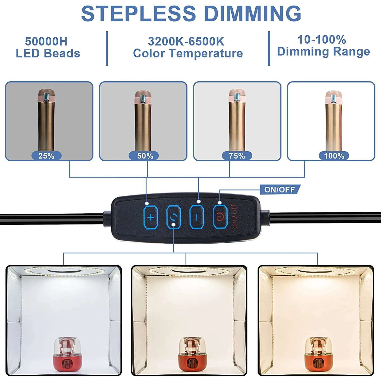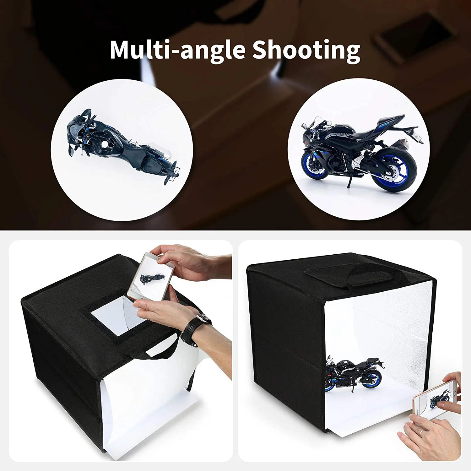 | Intégration de 120 perles de lumière LED | Fenêtre de prise de vue horizontale and verticale | Arrière-plans détachables en PVC et papier | Montage en quelques secondes |