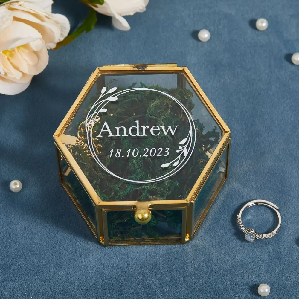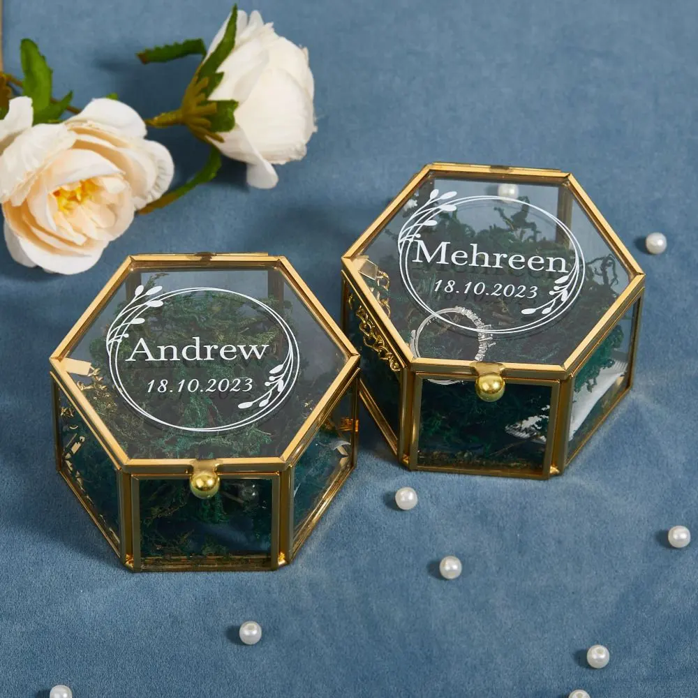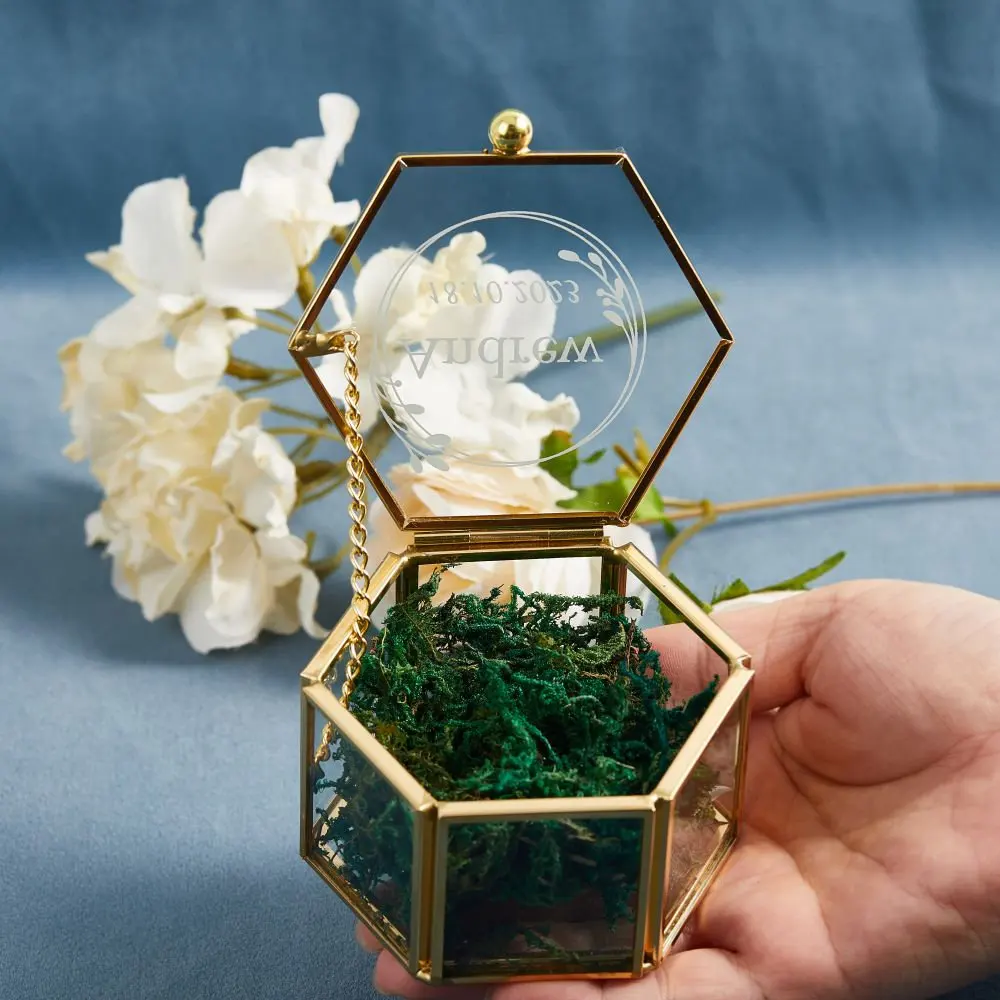 La boîte à matiques en verre hexagonale avec or mousse ou or rose est une boîte à matiques personnalisée pour la cérémonie de mariage. Elle sert également de porte-bague moderne avec des dimensions de 7.5*7.5*4.3cm. Ce produit est fabriqué avec un artisanat rétro et vieux en utilisant du cuivre et du verre. Il est également respectueux de l’environnement, parfait pour une boîte de bague de mariage.