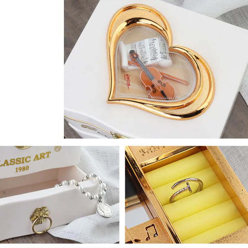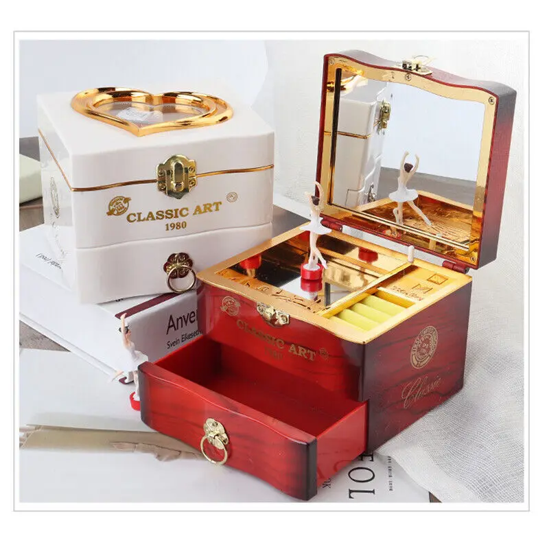 - Danseuse se lève et s’arrête de danser lorsque le couvercle de la boîte à bijoux est fermé.