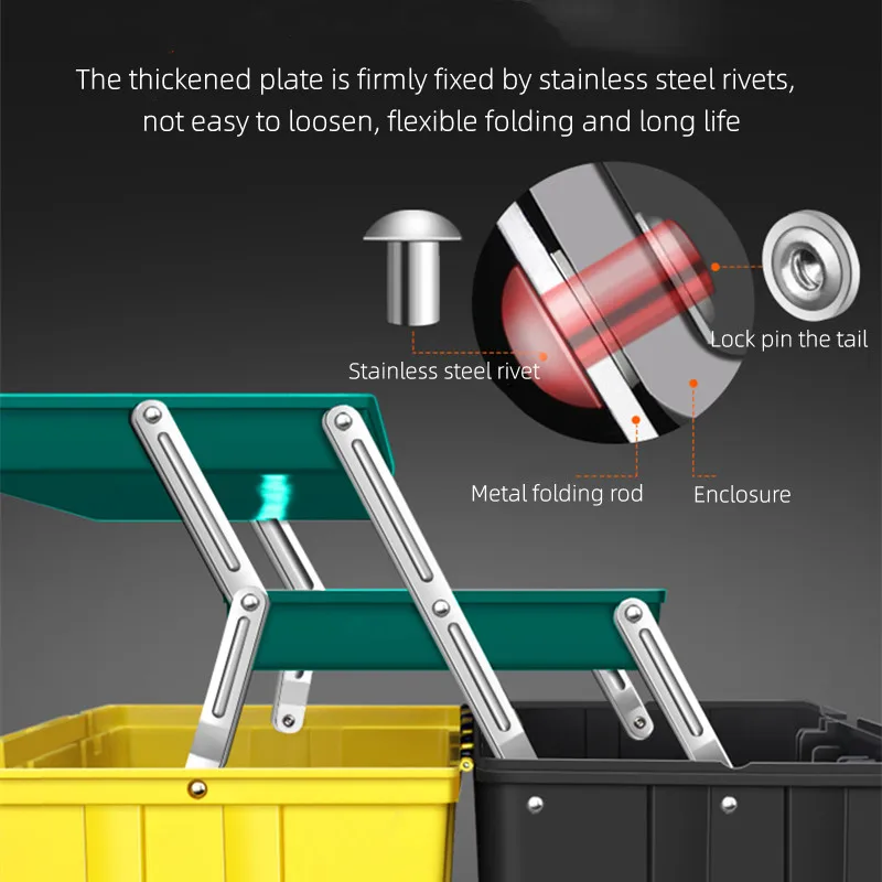 La boîte à outils pliable en plastique à trois couches est un outil multifonctionnel et pratique pour l’entretien ménager et le travail d’électricien. Sa conception à trois couches offre une grande capacité de rangement, permettant de mieux utiliser l’espace disponible. Le plateau à outils avec poignée et accès latéral offre des solutions de stockage flexibles, facilitant l’accès aux outils.