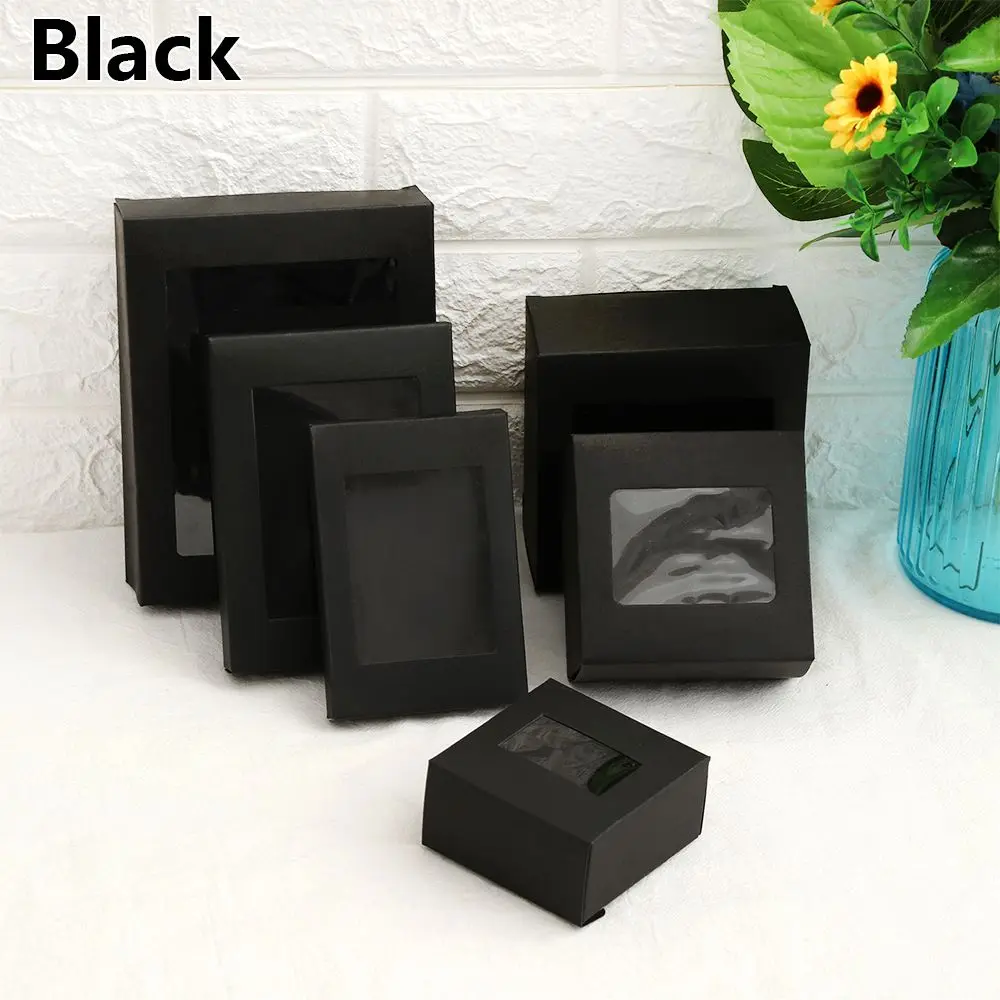 Les dimensions des boîtes disponibles sont 8x8x4cm, 10x10x5cm, 12x12x6cm, 12.5×8.5×1.5cm, 14.5×10.5×2.5cm, et 17.5×13.5×3.5cm. Les couleurs disponibles sont marron, blanc et noir. La boîte est conçue avec une fenêtre en PVC transparente, permettant de voir le contenu à l’intérieur.
