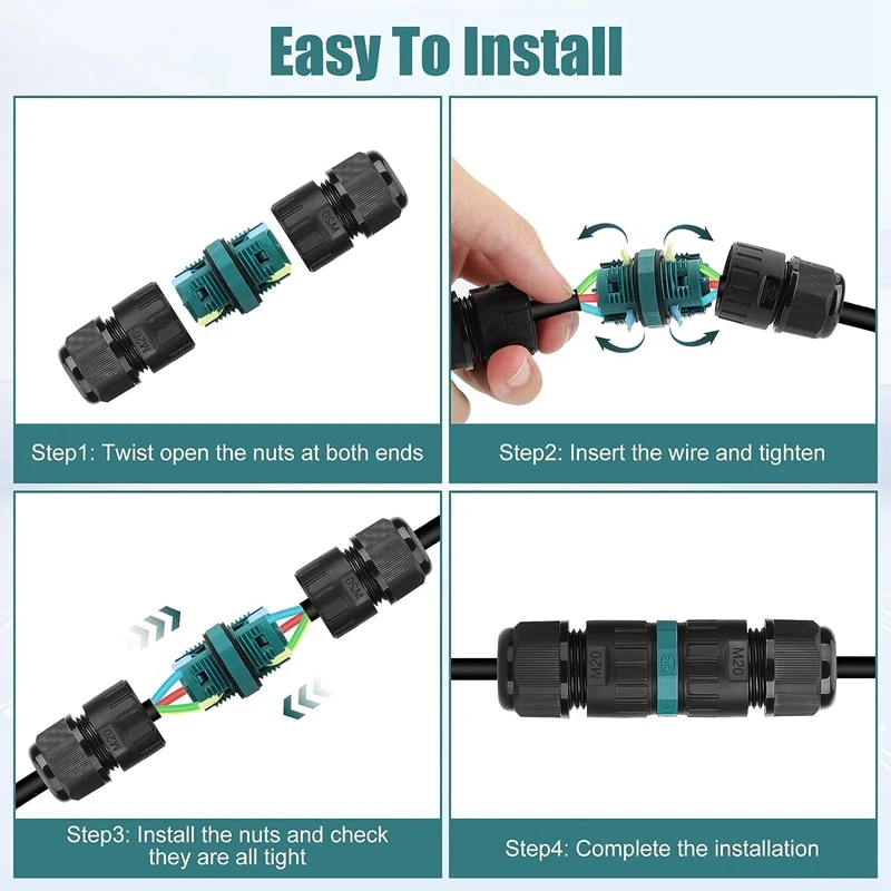 L’installation de ces boîtes de connecteurs est extrêmement facile. Il suffit d’ouvrir les deux extrémités du connecteur, de passer le câble à l’intérieur, d’ajuster l’anneau en caoutchouc à la taille du câble, puis de serrer pour assurer l’étanchéité. Aucun outil ni vis n’est nécessaire pour cette opération.
