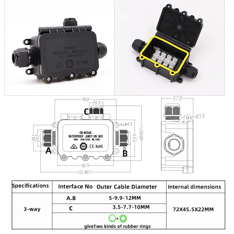 Cette boîte de jonction est livrée avec deux bagues en caoutchouc de tailles différentes, ce qui vous permet de l’adapter à différentes tailles de câbles. Elle peut être utilisée pour diverses applications, que ce soit à l’intérieur ou à l’extérieur.