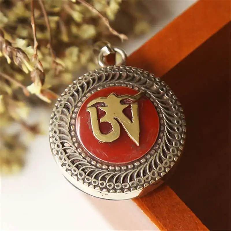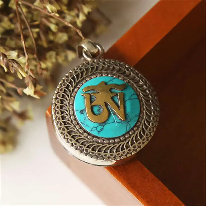 La boîte de prière est faite de cuivre métal blanc de couleur argent avec des clips incrustés de pierre turquoise de couleur bleu-vert. Elle comporte des symboles bouddhistes sculptés, notamment le mantra OM en laiton doré. Ce mantra représente les premiers mots des mantras de six mots. La boîte de prière a une belle taille de dia.29 – 30mm.