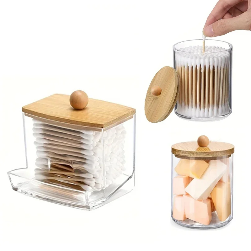 Test et Avis sur le HOJar-Boîte de Rangement en Acrylique pour Coton-Tip, Support Rond pour Coton-Tige, Distributeur avec Couvercle en Bambou