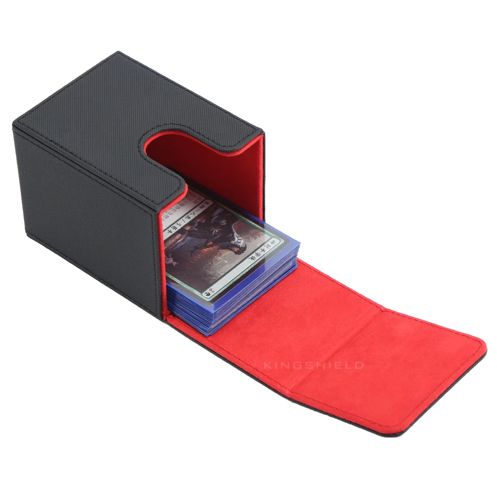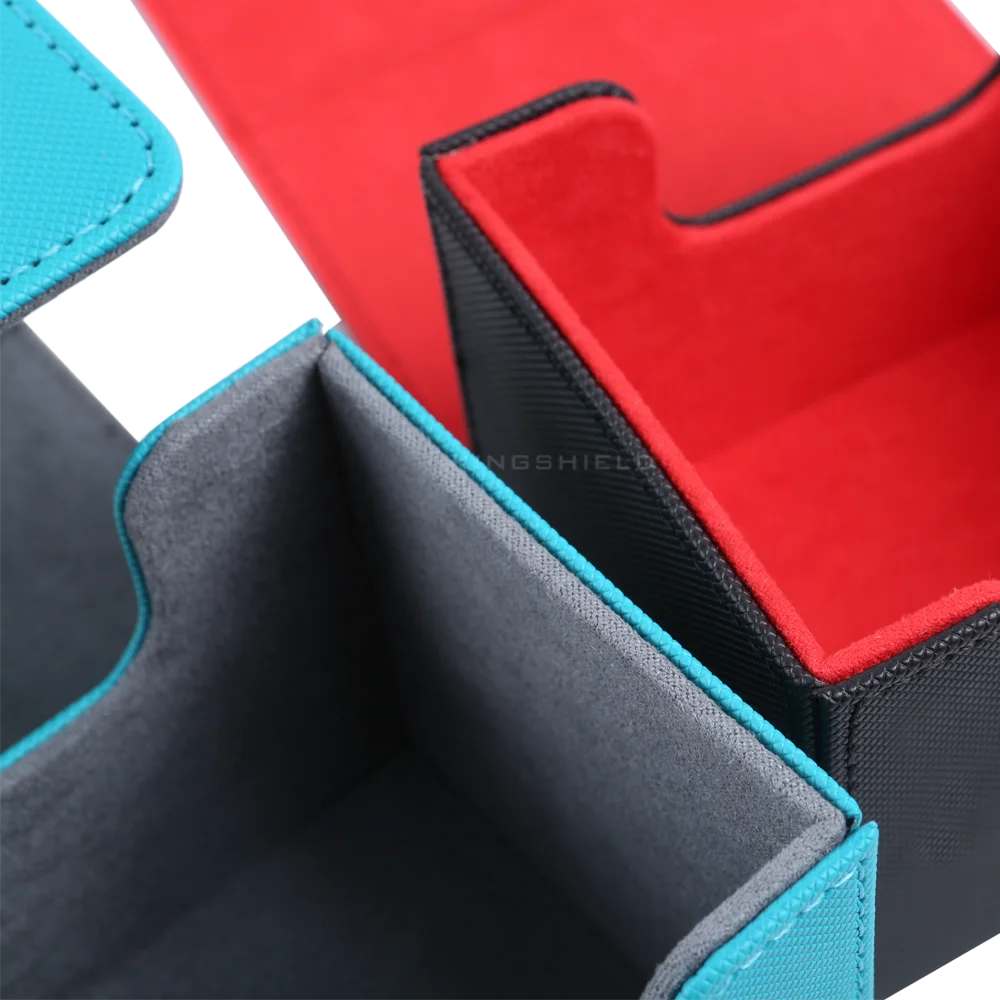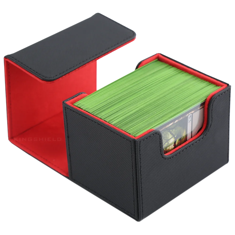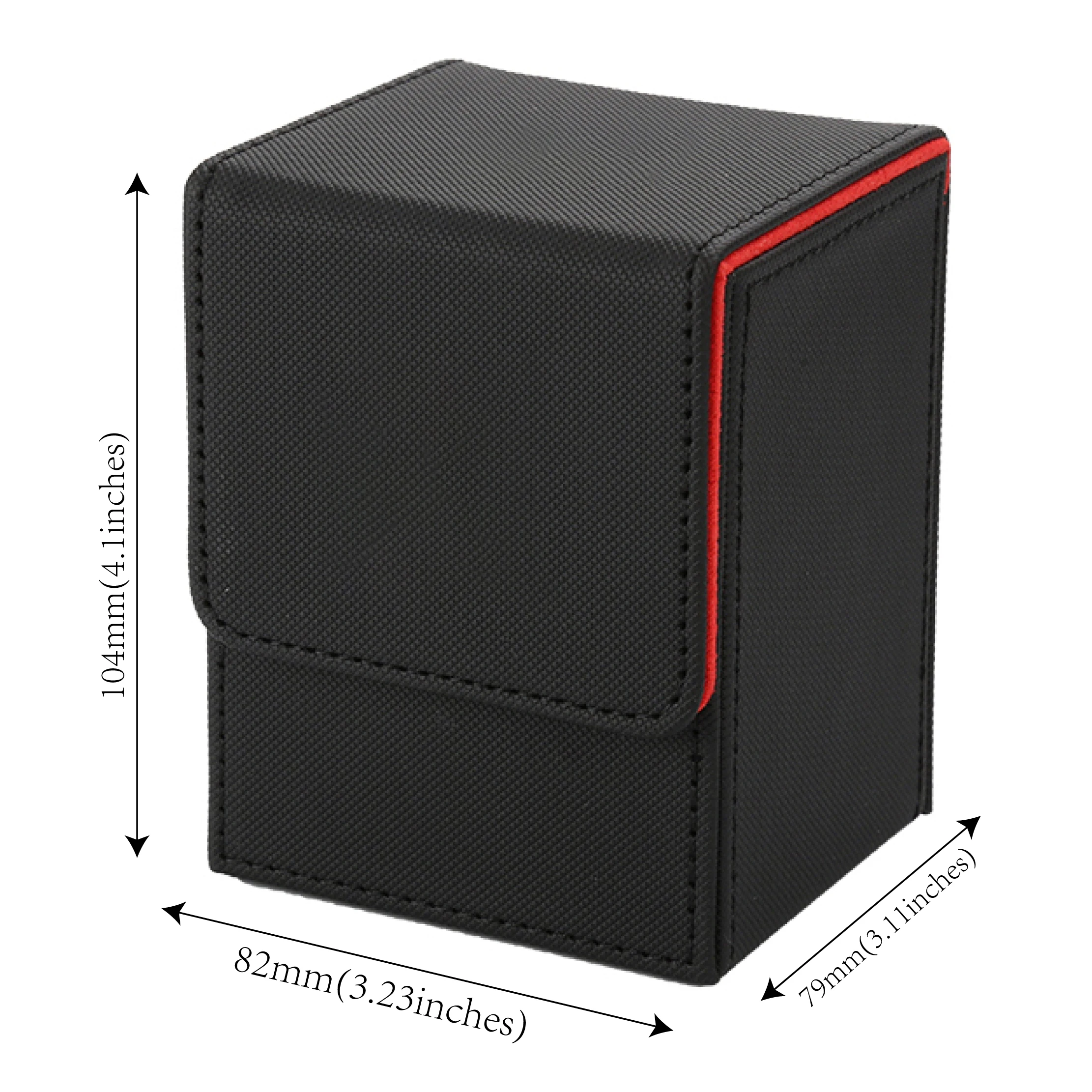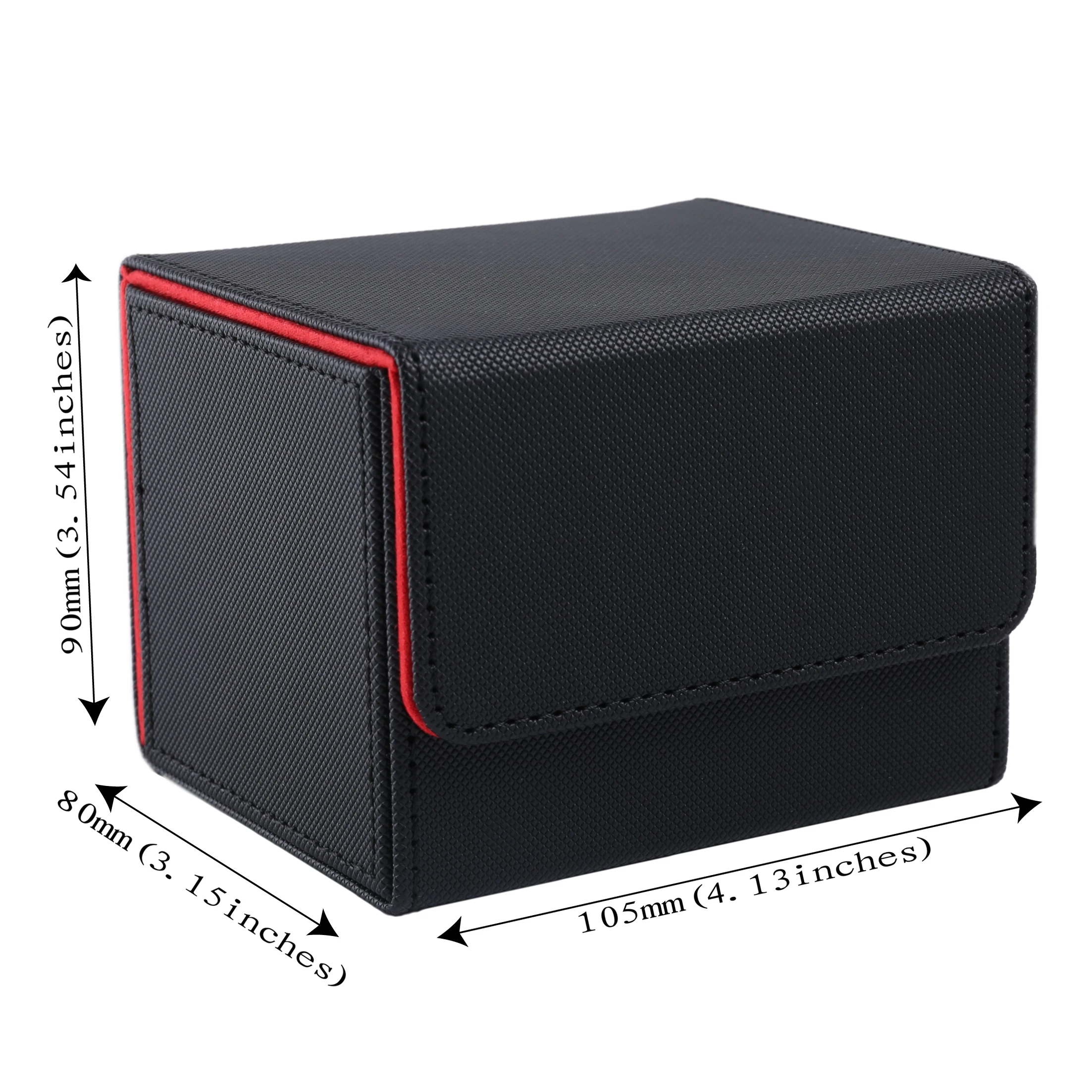 Le boîtier peut contenir jusqu’à 100+ cartes à double manche, 120+ cartes à simple manche ou 200+ cartes sans manche. Grâce à ses 4 aimants, la fermeture est parfaite. La taille du boîtier est approximativement de 105x80x90mm / 104x82x79mm.