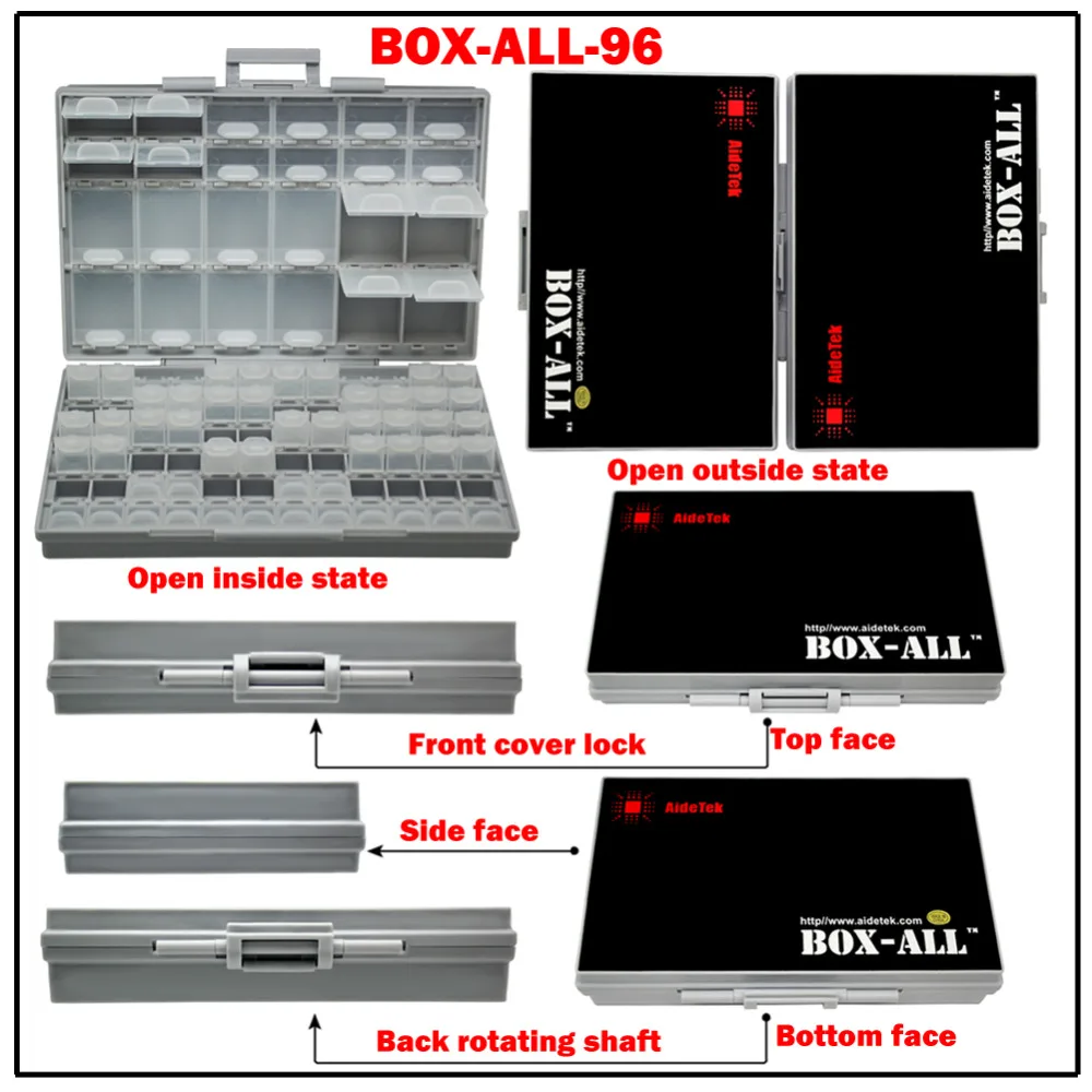 Le boîtier BOXALL96 est un excellent organisateur de composants à montage en surface. Il comprend 96 compartiments de différentes tailles, répartis en 72 sur un côté et 24 de l’autre. Chaque compartiment est doté d’un couvercle individuel pour une meilleure protection. Les dimensions extérieures du boîtier sont de 22,4 cm de longueur, 14,5 cm de largeur et 4,65 cm de hauteur. Il est donc compact et facile à transporter. Le boîtier peut contenir jusqu’à 1000 pièces de résistances ou condensateurs de taille 1206. Il est certifié conforme aux réglementations RoHS et est léger, pesant environ 500g lorsque tous les compartiments sont remplis. Une option d’impression d’étiquettes est également disponible. Pour une utilisation optimale du boîtier, il est recommandé de vérifier que chaque couvercle se ferme hermétiquement avant de fermer le couvercle.