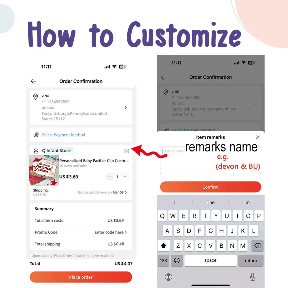 - Dans la section personnalisation, envoyez-moi les noms dans l’ordre dans le chat ou les commentaires AliExpress