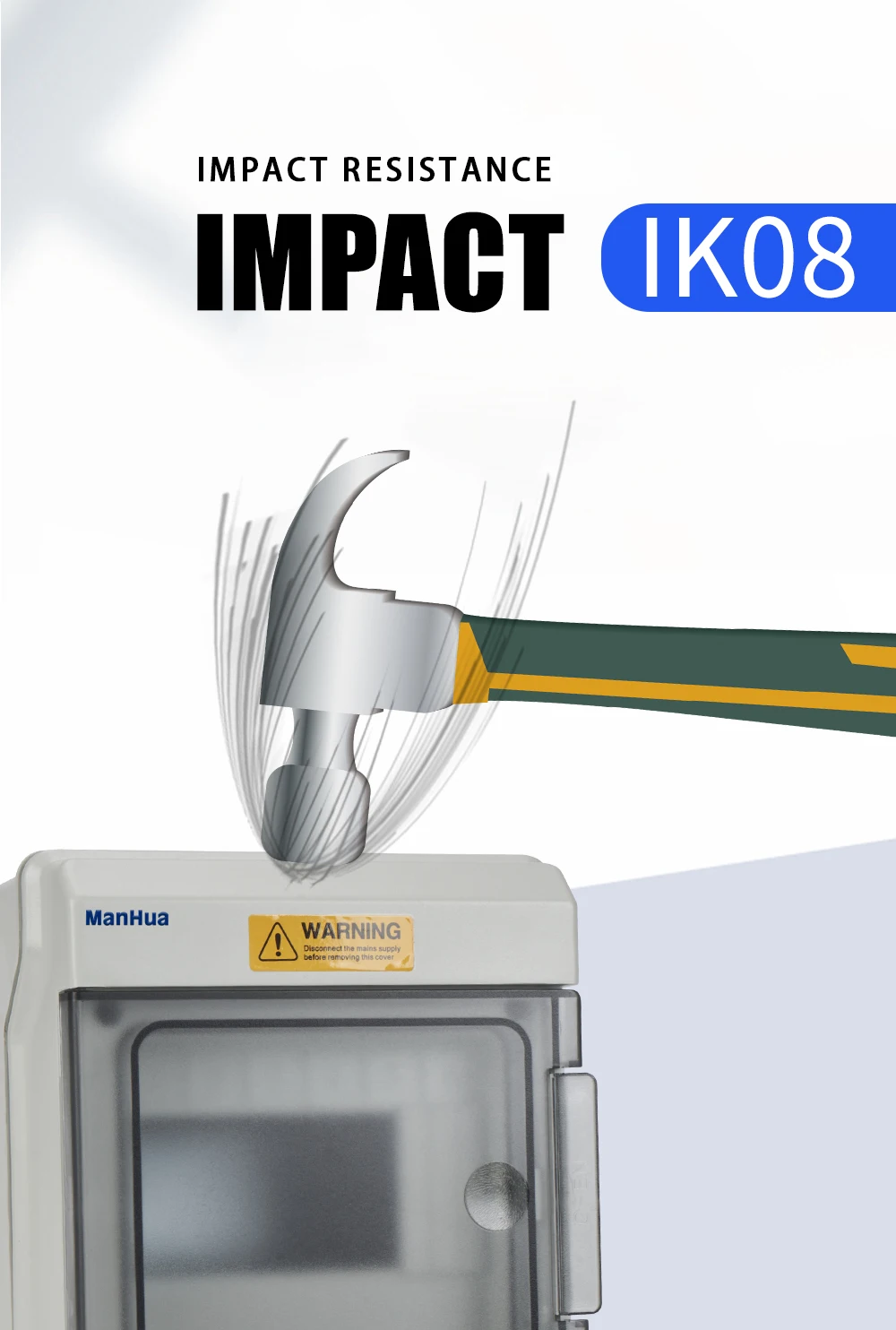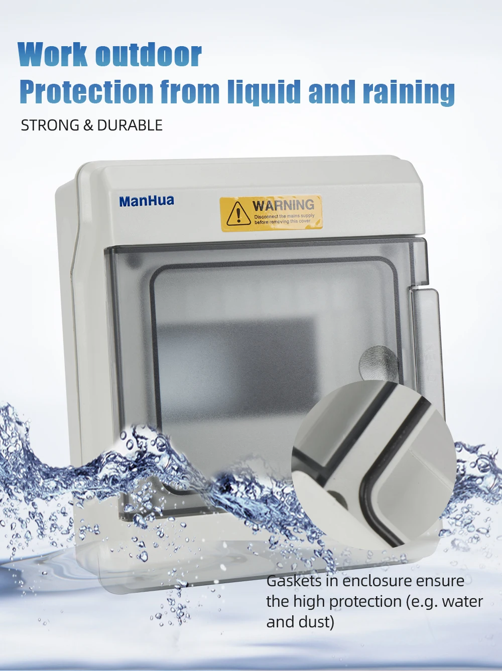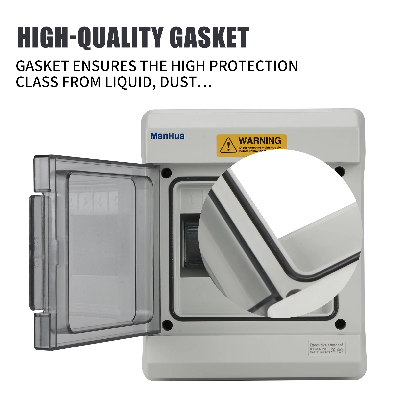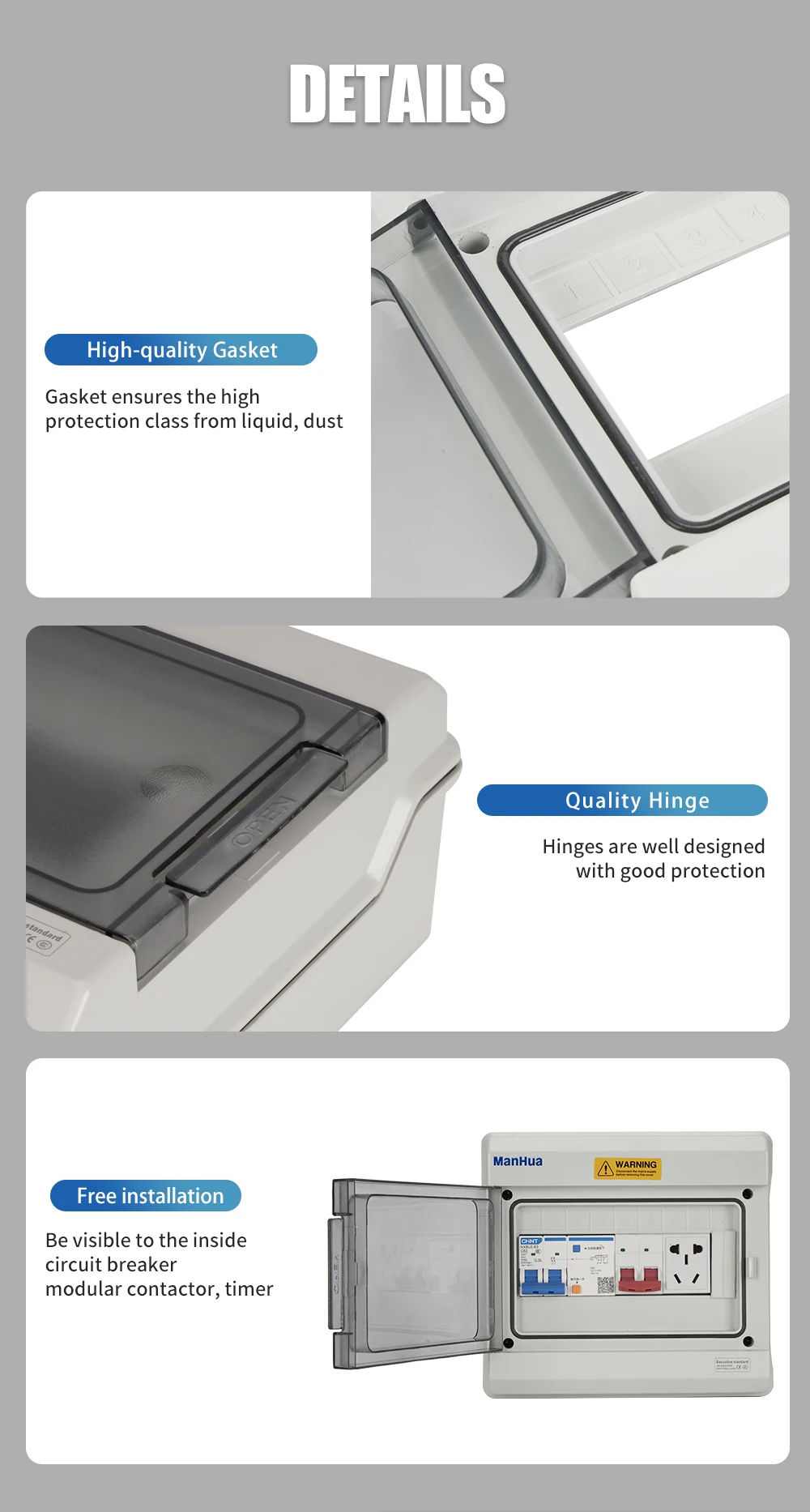 - Couvercle en appuyant sur l’ouverture et la fermeture: le couvercle de la boîte de distribution adopte la méthode d’ouverture et de fermeture en appuyant sur, appuyez simplement pour ouvrir le masque, et il y a une structure charnière avec une position autobloquante lorsqu’elle est ouverte.