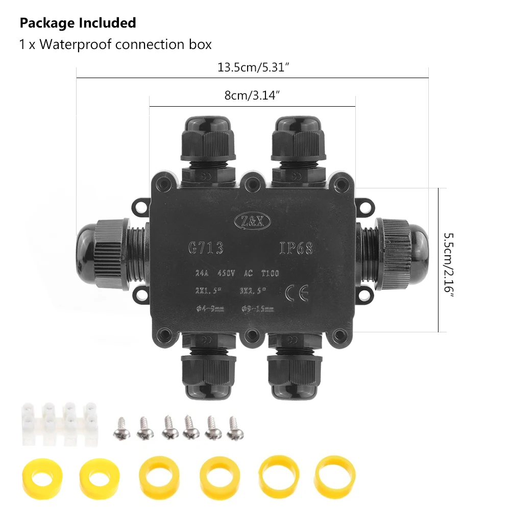 | Caractéristiques | Connecteurs de manchon de protection de ligne de câble souterrain de boîte de jonction étanche de fil électrique extérieur. Fabriqué en boîtier PC en plastique de haute qualité, il ne se fissurera pas et ne se décolorera pas au soleil, résistant à la corrosion et aux hautes températures, durable pendant des années d’utilisation. IP68 classe étanche de haut niveau/borne en plastique étanche à l’humidité/à la poussière/anti-UV, il peut être installé en tant que boîte de jonction externe, largement utilisé dans les installations imperméables extérieures, les lampadaires, les lumières enterrées, lumières de jardin, lumières d’inondation extérieures, etc. Facile à installer. Petit volume, juste un tournevis, de sorte que le connecteur de câble installé dans n’importe quel endroit où il a besoin. Large utilisabilité. Les boîtes de jonction appropriées aux genres de panneaux d’affichage de LED, lumières de tunnel, éclairage de paysage de route de LED, affichage extérieur de LED, lumières de jardin. Autres applications dans l’ingénierie sous-marine ou souterraine, les chauffe-eau solaires, diverses machines et équipements. |