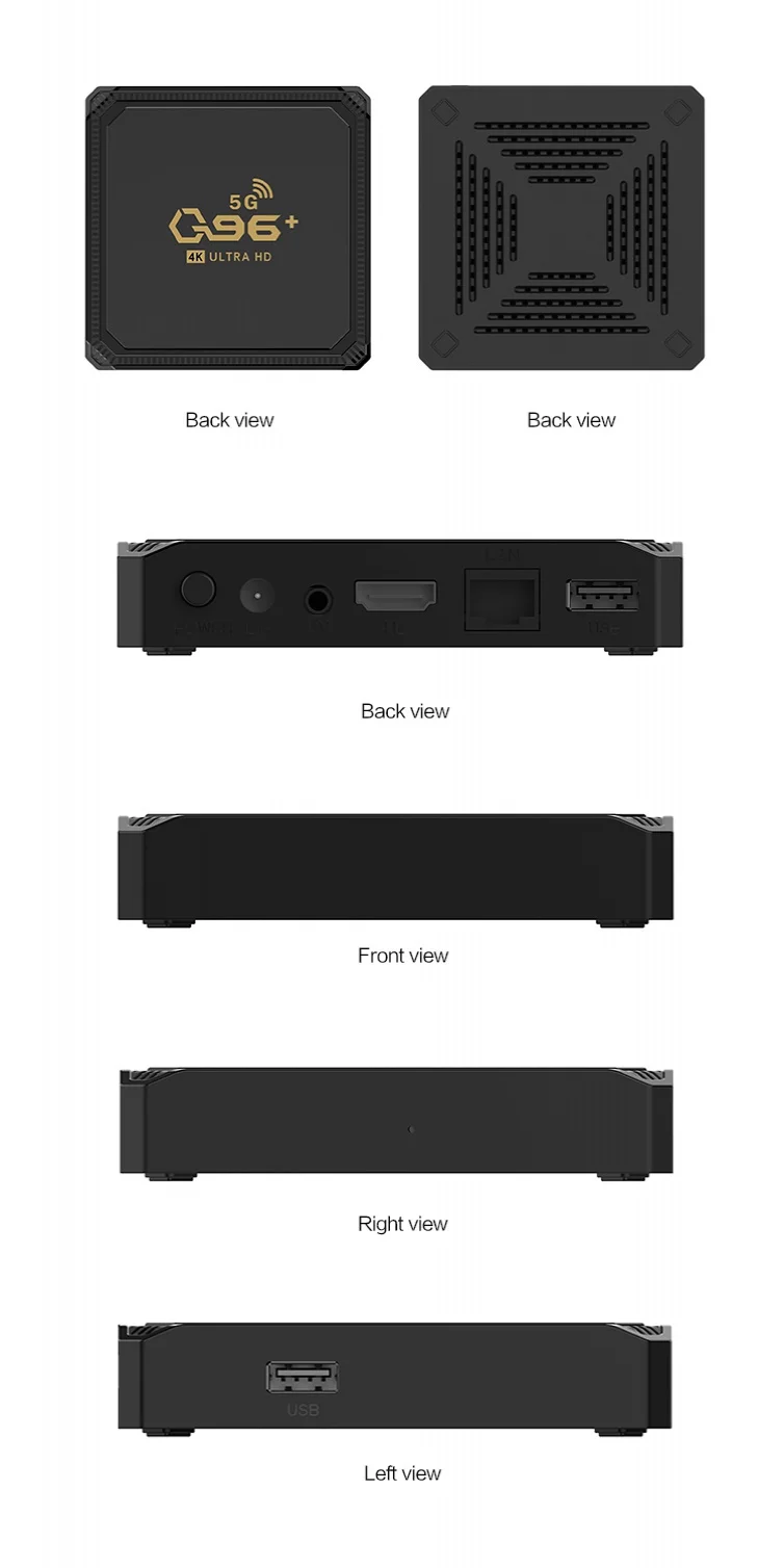 Le dernier boîtier décodeur TV prend en charge la résolution 4K, offrant des images ultra-claires et des effets visuels impressionnants. La technologie de décodage H.265 permet d’économiser la moitié de la bande passante par rapport à la technologie H.264 et peut afficher des détails d’image vifs et riches. Avec une RAM de 2/4/8 Go et une ROM de 16/64/128 Go, une grande capacité vous permet de télécharger plus d’applications et de jeux sur votre boîtier TV. L’utilisation du processeur quadricœur Hisilicon HI3798M garantit un fonctionnement fluide et flexible sans se soucier des lenteurs. Le dernier système Android 9.0 est livré avec une boutique d’applications open source que vous pouvez apprécier à volonté. Le support de la version HDMI 2.0 facilite le transfert de vos photos et vidéos sur votre écran de télévision. Une connexion WiFi double bande 2,4G/5G offre des signaux sans fil plus stables, vous permettant de profiter de médias haute définition et d’expériences de jeu. Le boîtier prend en charge les souris et claviers via un port USB; il prend également en charge une souris et un clavier sans fil 2,4 GHz via un dongle USB 2,4G. Plusieurs scénarios d’utilisation : bureau, divertissement à domicile, présentations de conférences, éducation scolaire, publicité numérique, etc. Spécifications : CPU : Hisilicon HI3798M Quad Core 64 bit ARM Cortex153 Réseau sans fil : 2,4G/5G Version Bluetooth : Oui Interface : HDMI Sortie HDMI 2.0, compatible avec un écran jusqu’à 4Kx2K Port USB : 2 ports USB 2.0 haut débit, compatible avec les clés USB et les disques durs USB Sortie AV : AV (port triple) LAN : RJ45 10M/100M Alimentation : CC 12V/2A Puissance de sortie du chargeur : CC 5V/2A Mémoire noire : 2/4/8 Go Mémoire : 16/64/128 Go