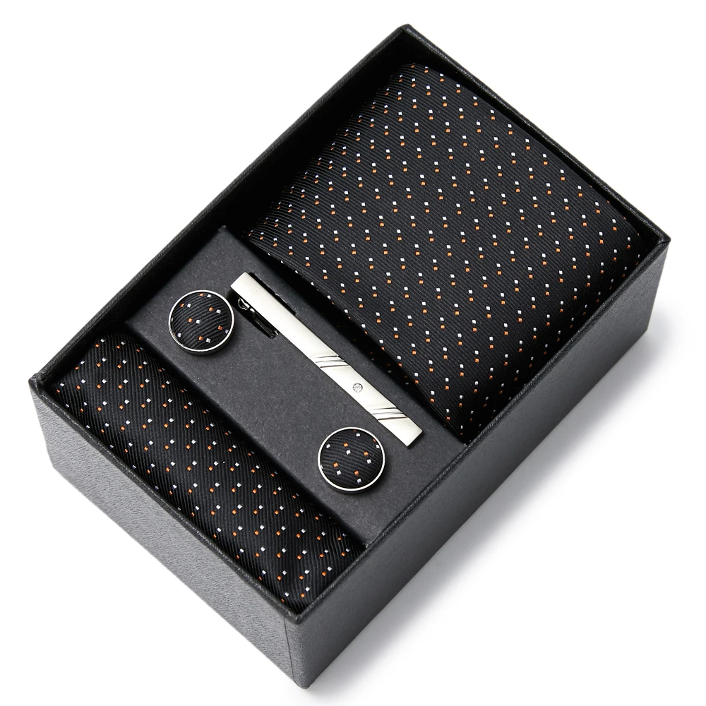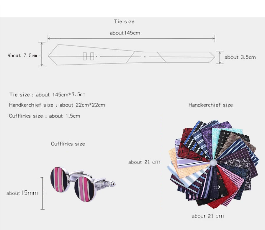| Neuf 1 cravates & 1 mouchoir & 1 paire de boutons de manchette & 1 pince à cravate aléatoire | 145cm de longueur et 7.5cm de largeur | Emballage de boîte cadeau protecteur | Italien | Guangzhou, Chine |