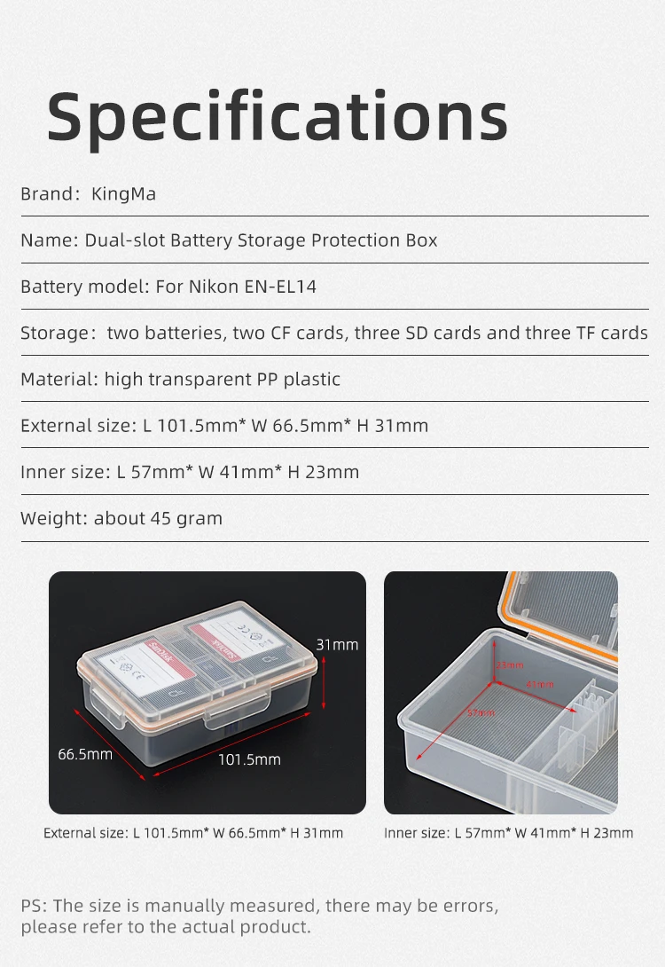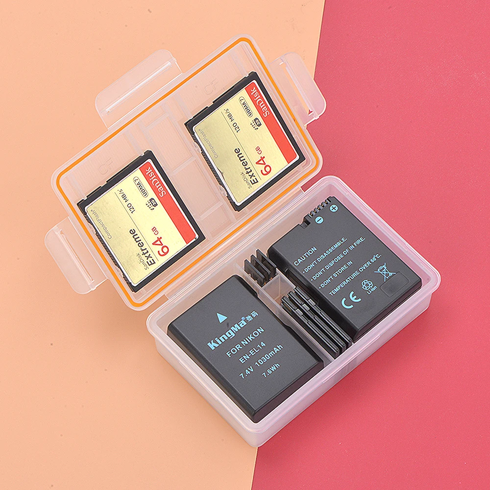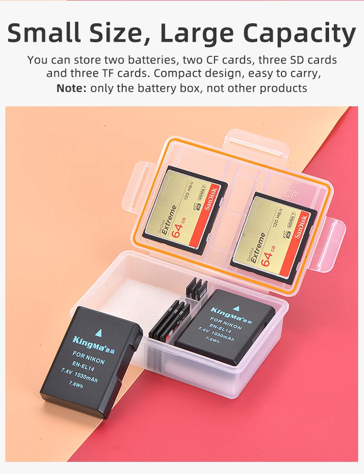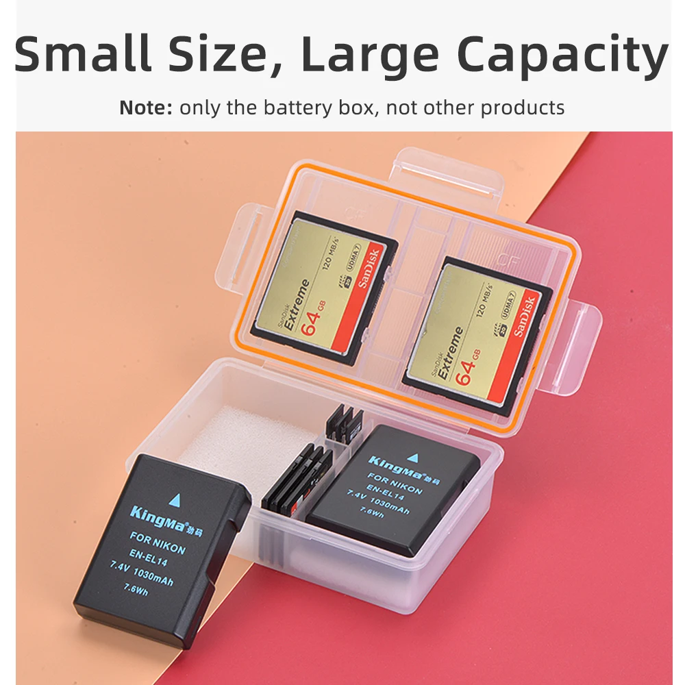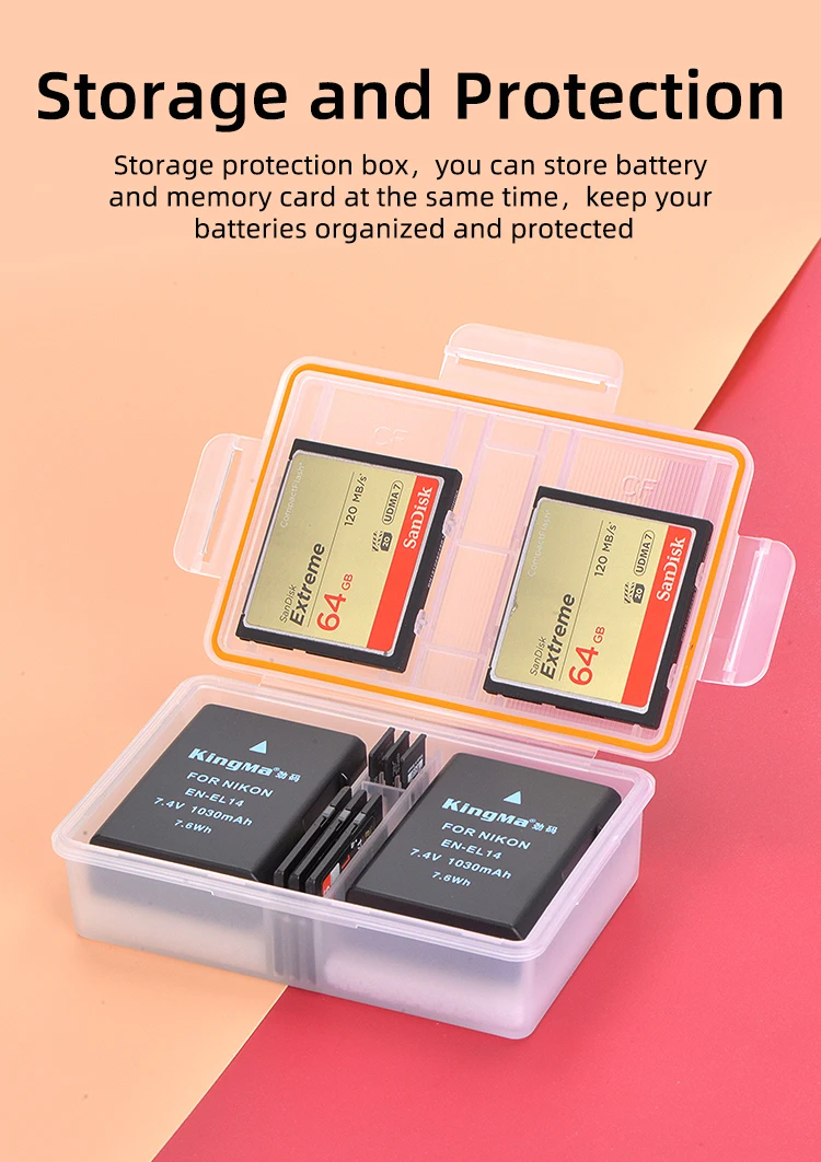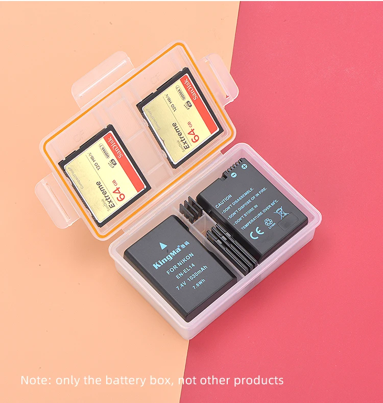 Le KingMa Batterie Boîtier en plastique est un support de batterie pratique pour les batteries Nikon EN-EL14 utilisées dans les appareils photo DSLR tels que les modèles D3200, D3300, D3400, D3100, D5100, D5200, D5300, D5500, D5600, P7000, P7100, P7700 et P7800. Ce boîtier de stockage en plastique PP hautement transparent offre un espace intérieur de 57mm * 41mm * 23mm pour stocker les batteries en toute sécurité.