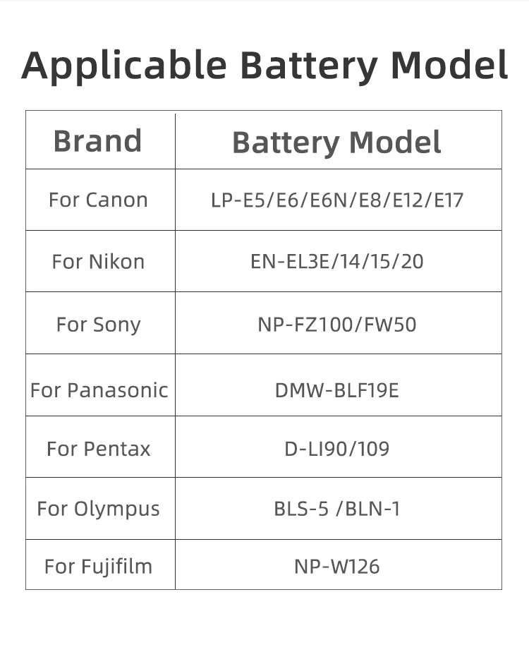 | 6 | Convient | Pour batterie EN-EL14 Nikon |
