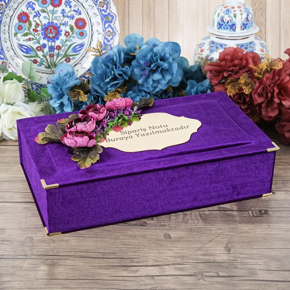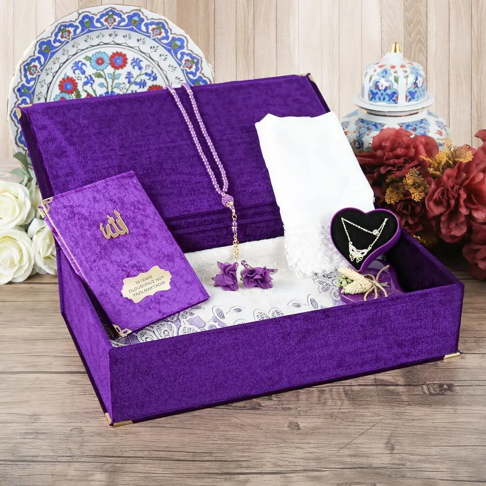 Tapis de prière cadeau de la fête des mères, livre Yasin en velours, collier, châle, chapelet, coffret en velours-violetCe set de cadeau musulman de luxe comprend un tapis de prière, un livre Yasin en velours, un collier, un châle, un chapelet et un coffret en velours-violet.