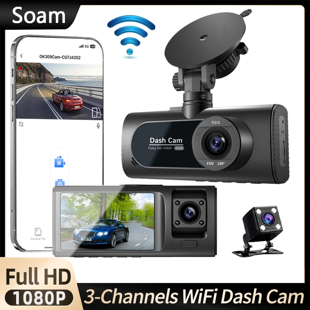 La Caméra de tableau de bord WiFi pour voitures est un enregistreur vidéo qui permet de capturer des vidéos en haute résolution (FHD 1080P) tout en offrant la fonctionnalité de caméra de recul pour faciliter les manœuvres de stationnement. Avec ses 3 canaux, elle permet de filmer à l’avant, à l’intérieur et à l’arrière du véhicule.