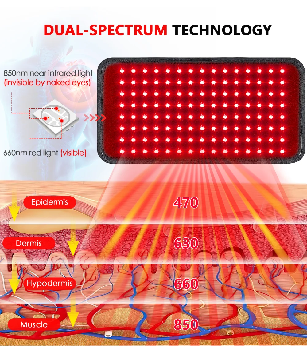 L’Astarexin-Bande est une ceinture de thérapie par la lumière rouge infrarouge qui utilise 120 LED pour fournir une lumière rouge profonde (660nm) et deux lumières infrarouges à pénétration profonde (850nm). Ces longueurs d’onde spécifiques permettent à la lumière de pénétrer en profondeur dans la peau, stimulant la réparation cellulaire et augmentant la circulation sanguine.