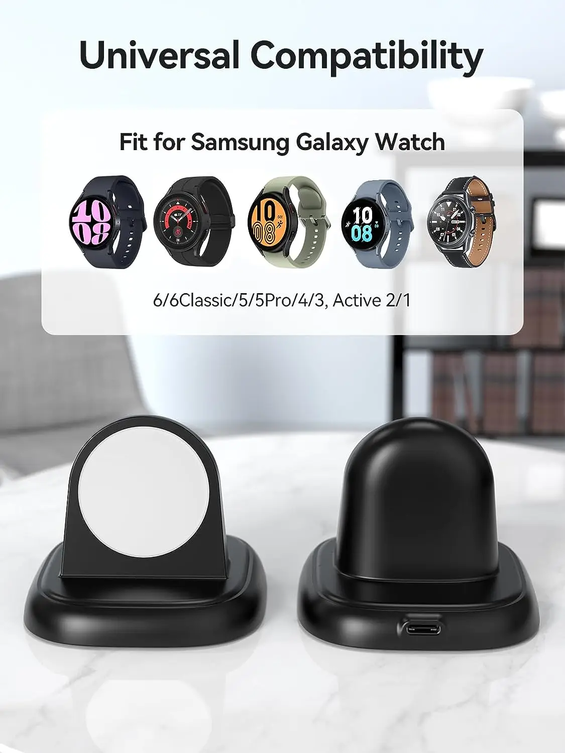 Aucun assemblage requis. Ce support de charge pour Samsung Galaxy Watch intègre un chargeur sans fil magnétique puissant. Il suffit de brancher votre montre sur l’aimant et tout est prêt. Compatible avec Samsung Galaxy Watch 6/6 Classic /5/5Pro/4/3, Active 2/1, Gear S4/S3/S2.