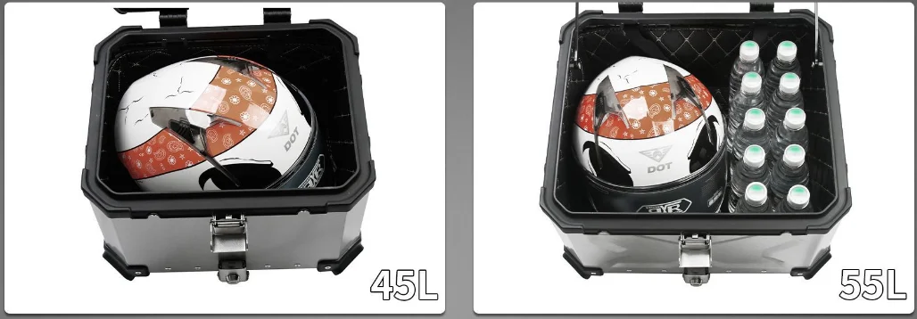 Cependant, nous avons remarqué que la capacité de stockage de ce coffre est de 45L ou 55L, ce qui peut être limité pour certains utilisateurs ayant besoin de plus d’espace de rangement. De plus, le poids net du coffre est de 6,75 kg pour le modèle 45L et 7,3 kg pour le modèle 55L, ce qui peut ajouter du poids supplémentaire à votre moto.