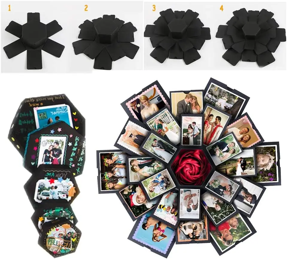 Le coffret album photo est livré avec 1 boîte d’explosion et 1 ruban de soie. Veuillez noter que la couleur du ruban est envoyée au hasard.