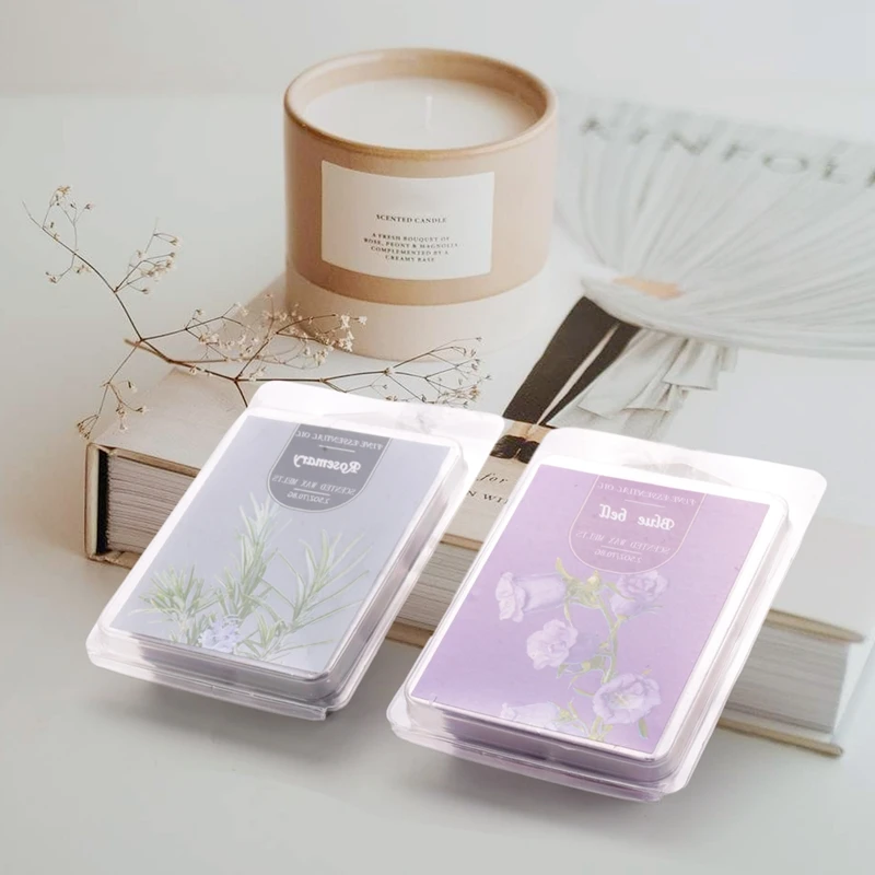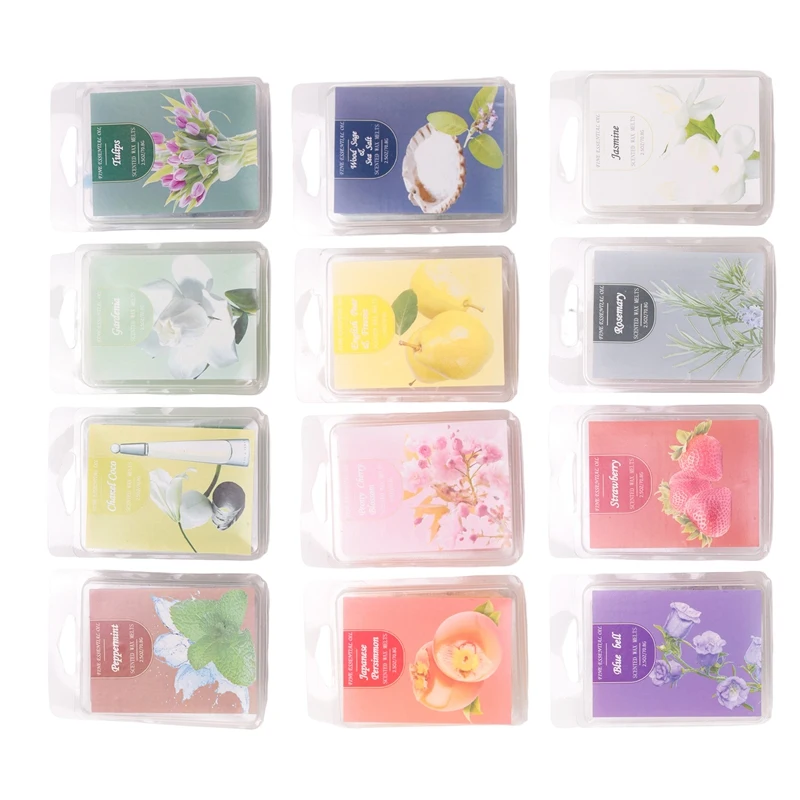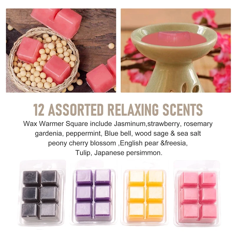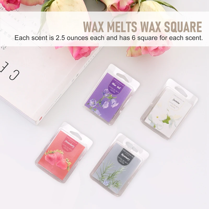 Les carrés chauffants à la cire comprennent le jasmin, la fraise, le romarin, le gardénia, la menthe poivrée, la cloche bleue, la sauge en bois et le sel de mer, la pivoine et la fleur de cerisier, la poire anglaise et le freesia, la tulipe, le kaki japonais.