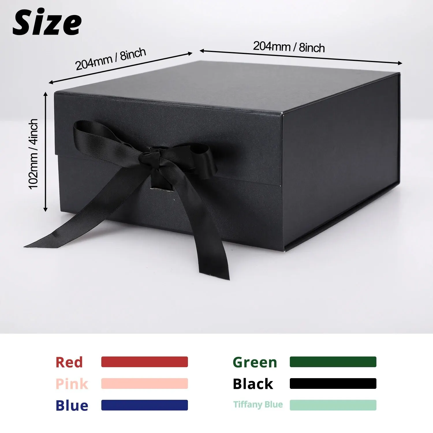 La boîte cadeau mesure 8x8x4 pouces (204x204x102mm), offrant suffisamment d’espace pour emballer votre cadeau. Nous proposons également 6 couleurs différentes pour répondre à vos besoins et préférences.