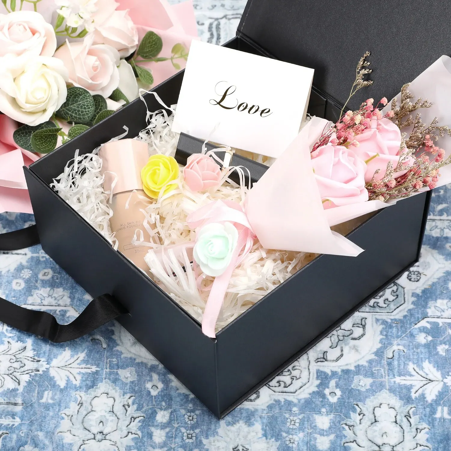Ce coffret cadeau est doté d’un couvercle magnétique et d’un ruban, ce qui le rend facile à assembler et à fermer. Le ruban peut également être utilisé pour créer un joli nœud pour une présentation encore plus impressionnante.