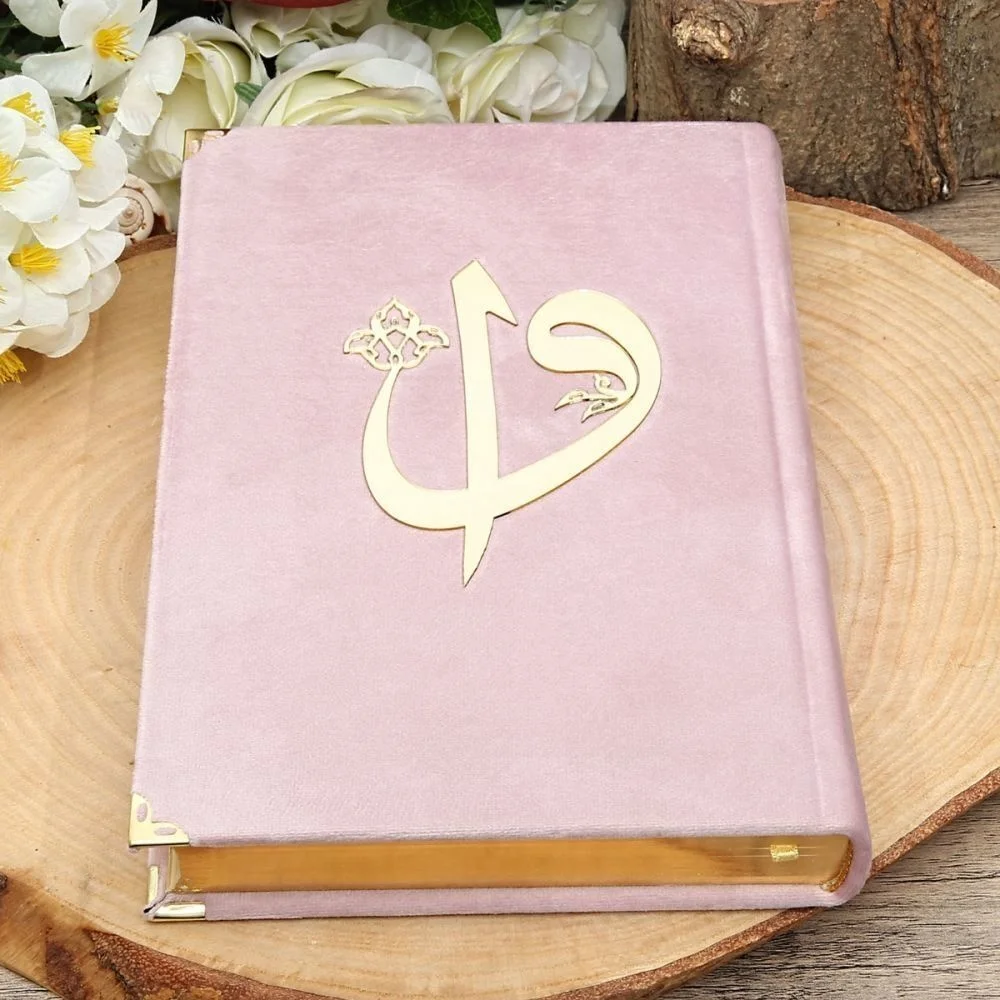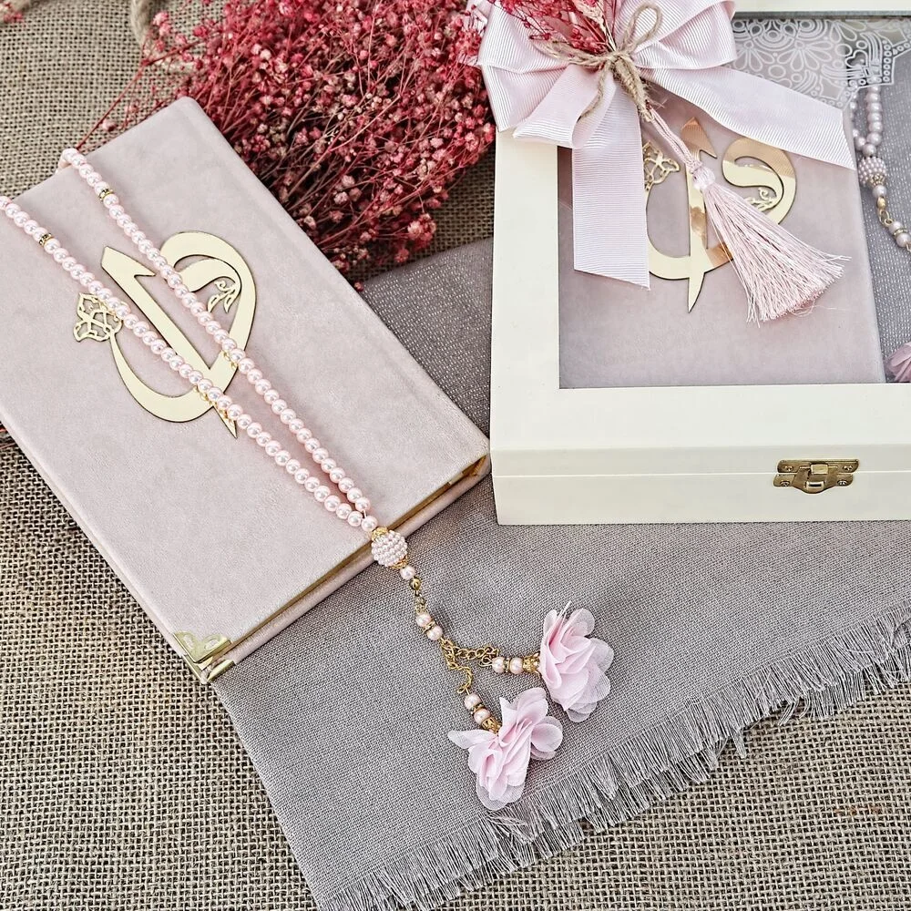 L’ensemble cadeau musulman de luxe pour femmes est présenté dans une boîte en bois ornée de fleurs décoratives et de rubans. Cet emballage cadeau islamique est idéal pour offrir à vos proches lors d’occasions spéciales. Il comprend un Coran couvert de velours avec un plexi Elif Vav, une boîte en bois, un sac de taille pour le Coran, un châle argenté et 99 perles de chapelet roses.