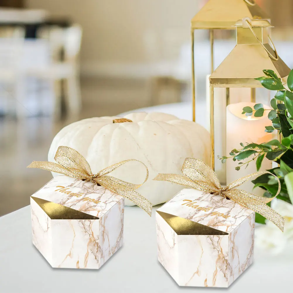 Les boîtes de faveur de mariage chaudes en marbre, or, boîtes à bonbons, sacs hexagonaux, chocolat soucieux, coffrets cadeaux avec rubans sont des accessoires parfaits pour ajouter une touche élégante à votre mariage, fête de douche nuptiale ou anniversaire. Les boîtes en carton robuste sont faciles à assembler et sont livrées avec des rubans dorés assortis.