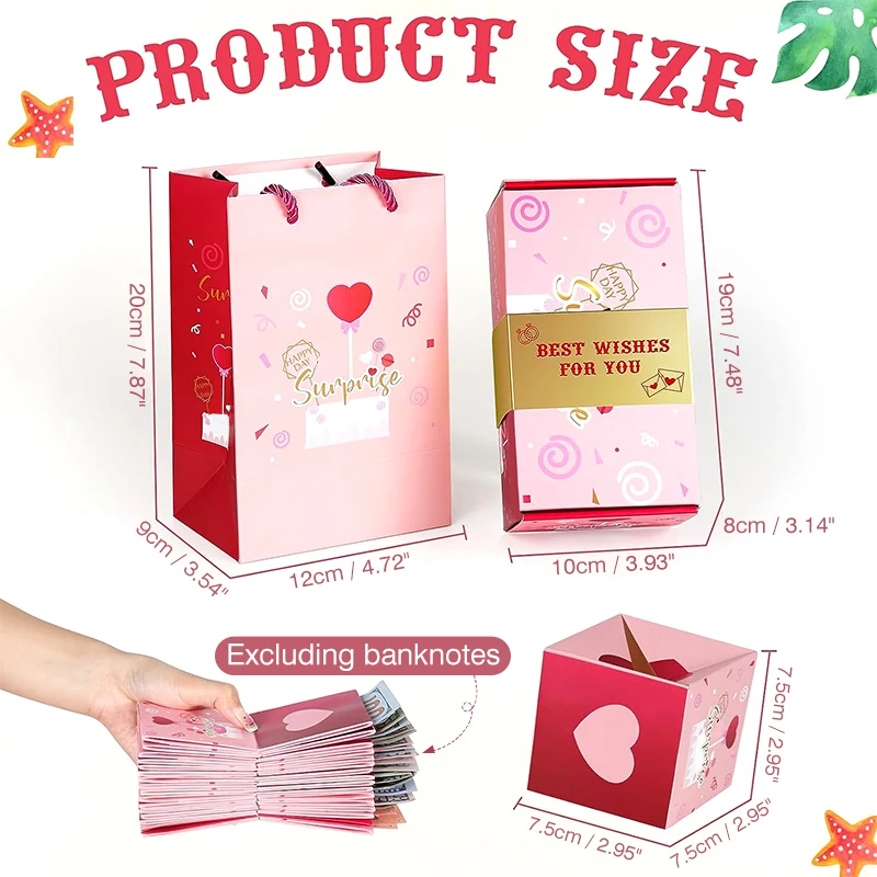 - Remplissez la boîte surprise avec de l’argent, des bouts de papier, des photos, des cartes ou tout ce que vous aimez. Partager l’amour et les souvenirs est illimité!