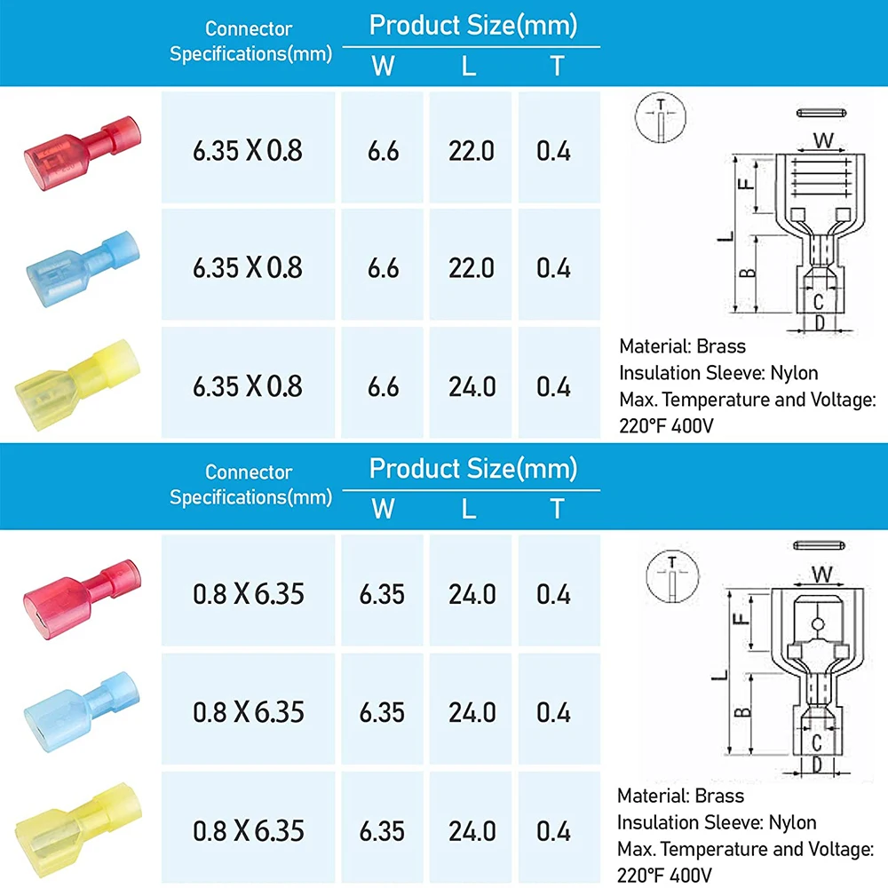 L’assortiment de connecteurs comprend le rouge (AWG 22, AWG 21, AWG 20, AWG 19, AWG 18, AWG 17, AWG 16), le bleu (AWG 15, AWG 14) et jaune (AWG 12, AWG 11, AWG 10). Connecteurs à filament en nylon, ces connecteurs peuvent être utilisés de 22 à 10 AWG sur le fil. Le rouge, le bleu et le jaune indiquent différentes tailles de connecteur électrique pour une identification facile lors de l’utilisation.
