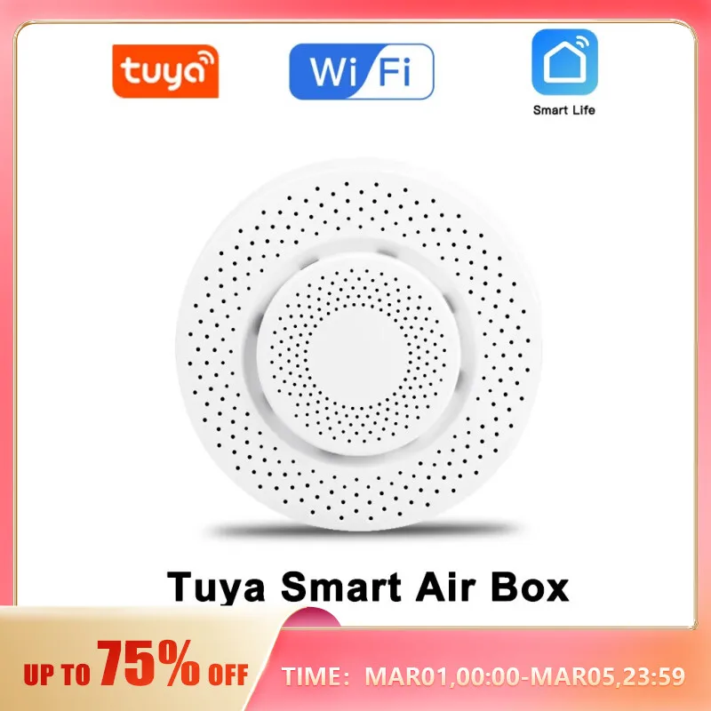 Le boîte à air intelligente Tuya WiFi est un dispositif domestique intelligent pour la surveillance à distance de l’environnement d’air. Il peut détecter le formaldéhyde, les COV (composés organiques volatils), le CO2, la température, l’humidité, et d’autres paramètres environnementaux. Lorsque les paramètres environnementaux dépassent la norme, il peut automatiquement optimiser l’environnement domestique en contrôlant les appareils tels que le climatiseur, le ventilateur, l’humidificateur et le purificateur d’air.