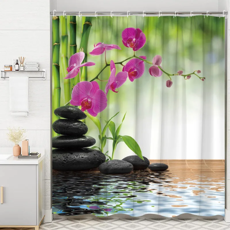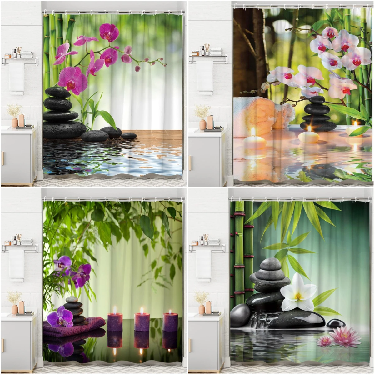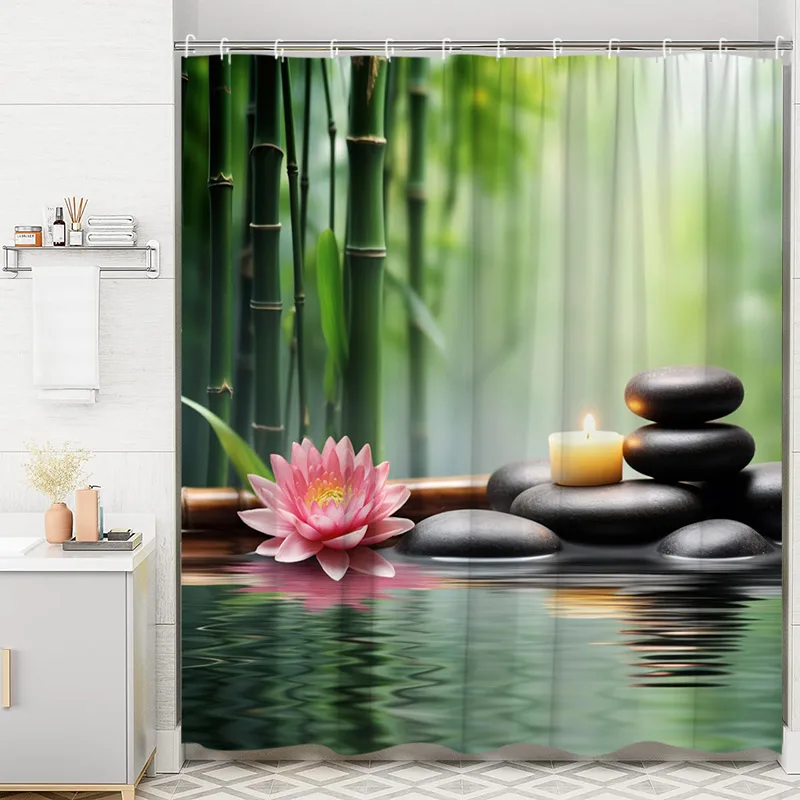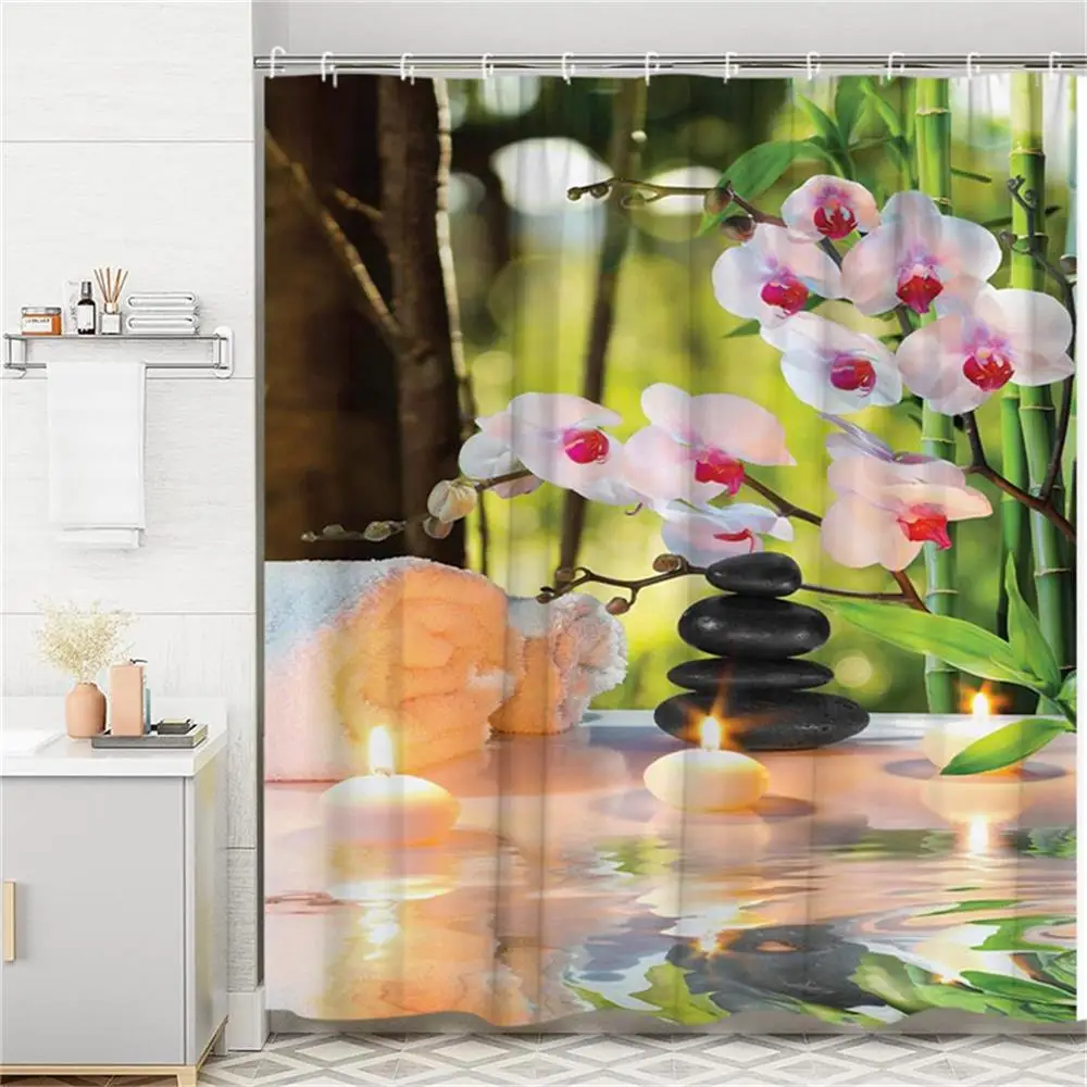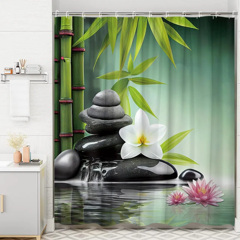 Rideau de douche en pierre de bambou vert Vermont, bougie Spa, feuilles naturelles, eau qui verticalement, paysage du Vermont, décoration d’intérieur avec crochets