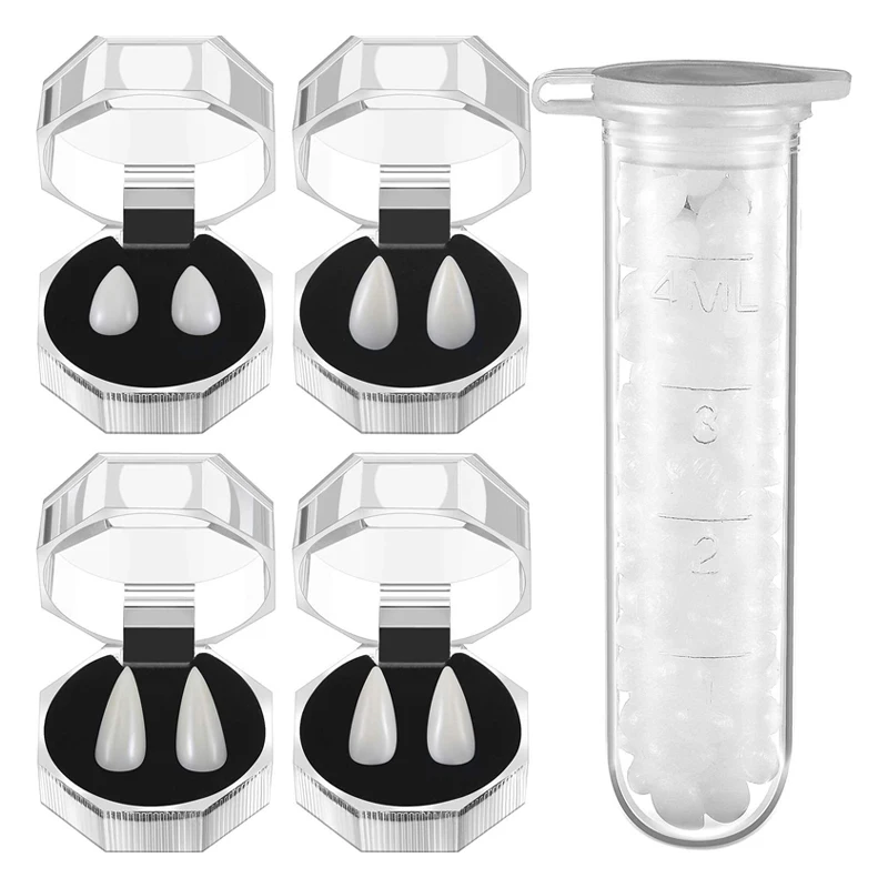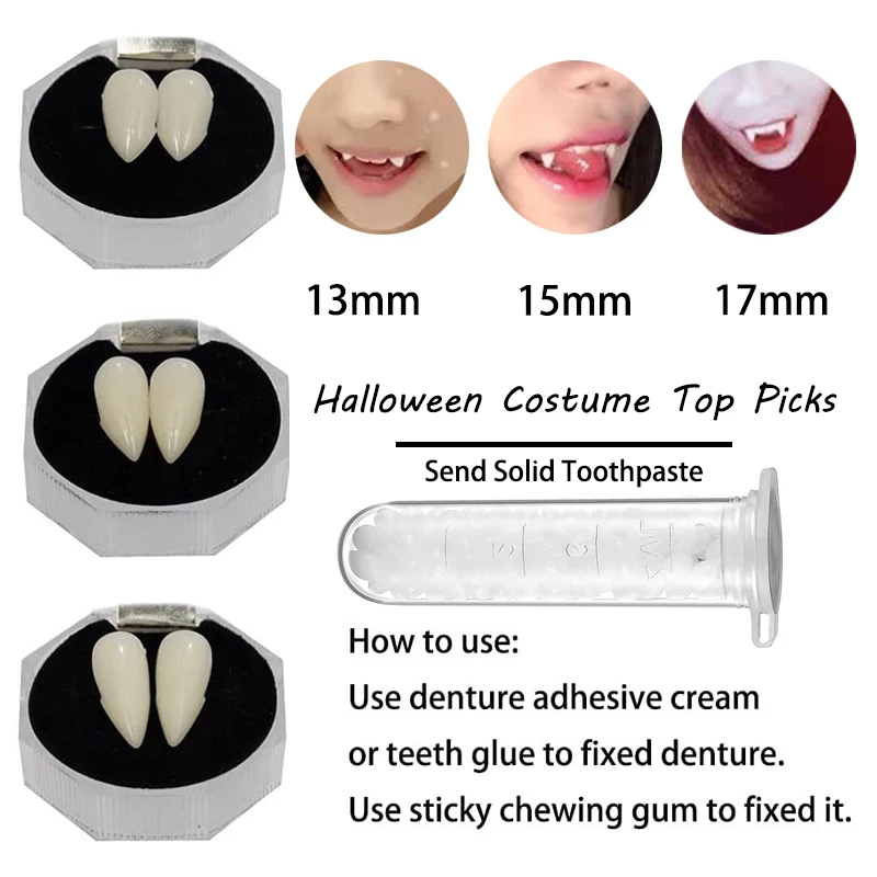 Pour les fixer, vous pouvez utiliser de la colle adhésive spéciale pour prothèses dentaires ou du chewing-gum collant. Les dents ont un effet crocs réaliste, ce qui leur donne un aspect effrayant et parfait pour Halloween ou les fêtes costumées. De plus, elles sont durables et peuvent être utilisées pendant des années.