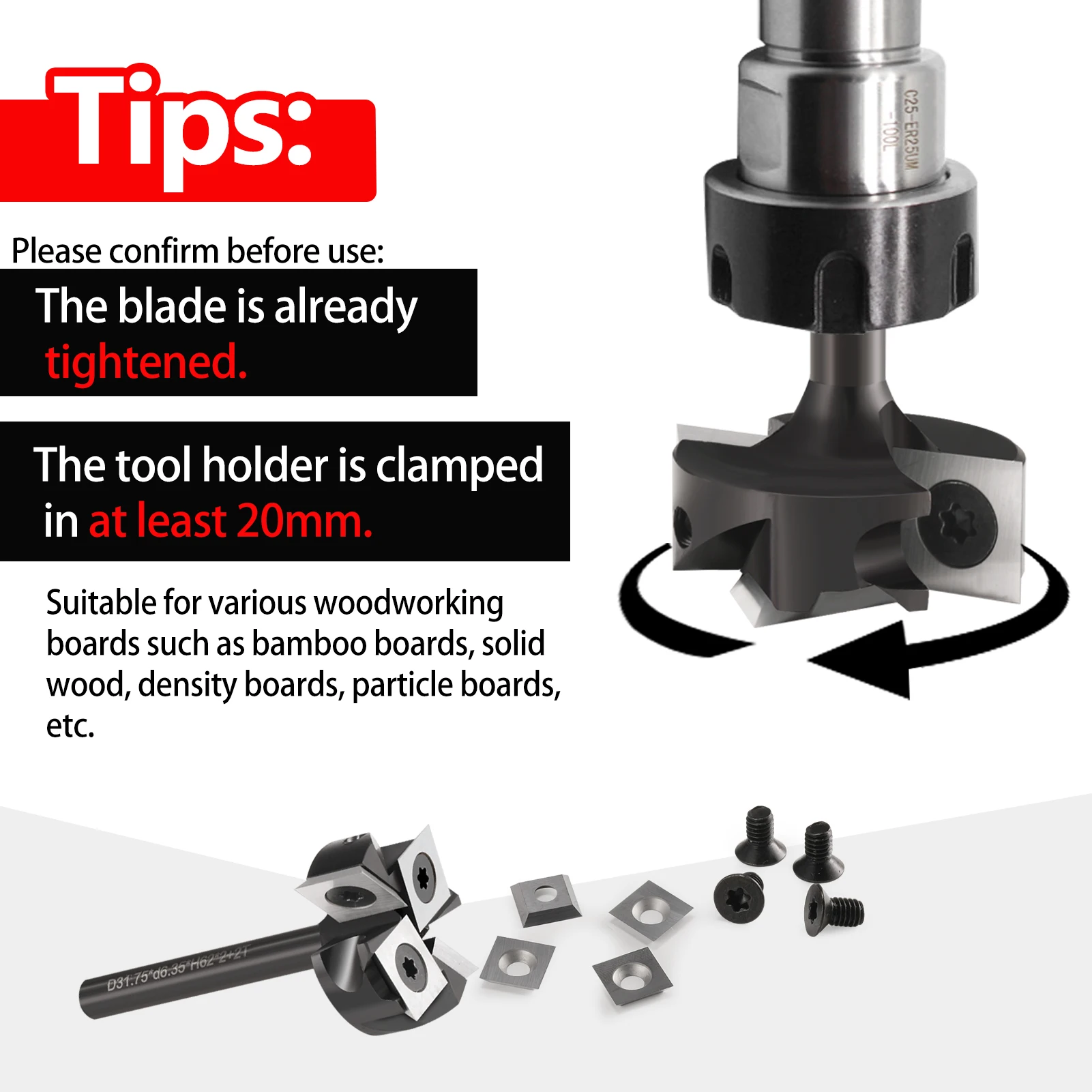 Avant d’utiliser ces fraises, assurez-vous que la vis de lame est correctement serrée et que la longueur de la partie de serrage du porte-outil est supérieure à 20mm.