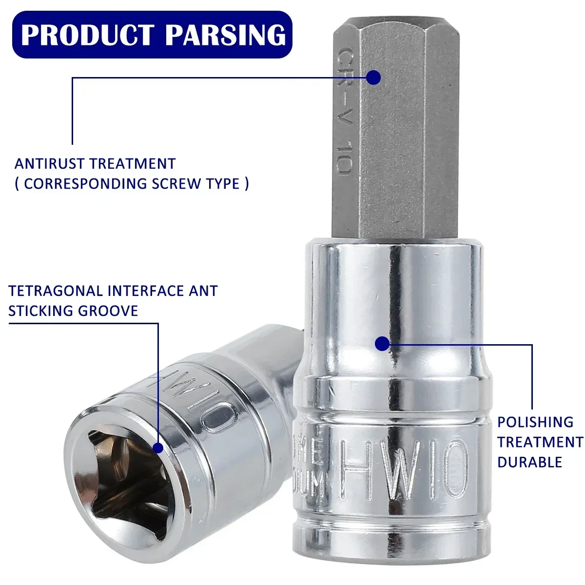 Les douilles à clé Allen de ce kit sont fabriquées en acier au chrome-vanadium durable, offrant ainsi une grande résistance et durabilité. De plus, le placage au nickel-chrome prévient la rouille et facilite le nettoyage.