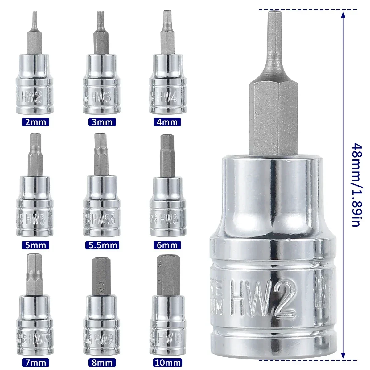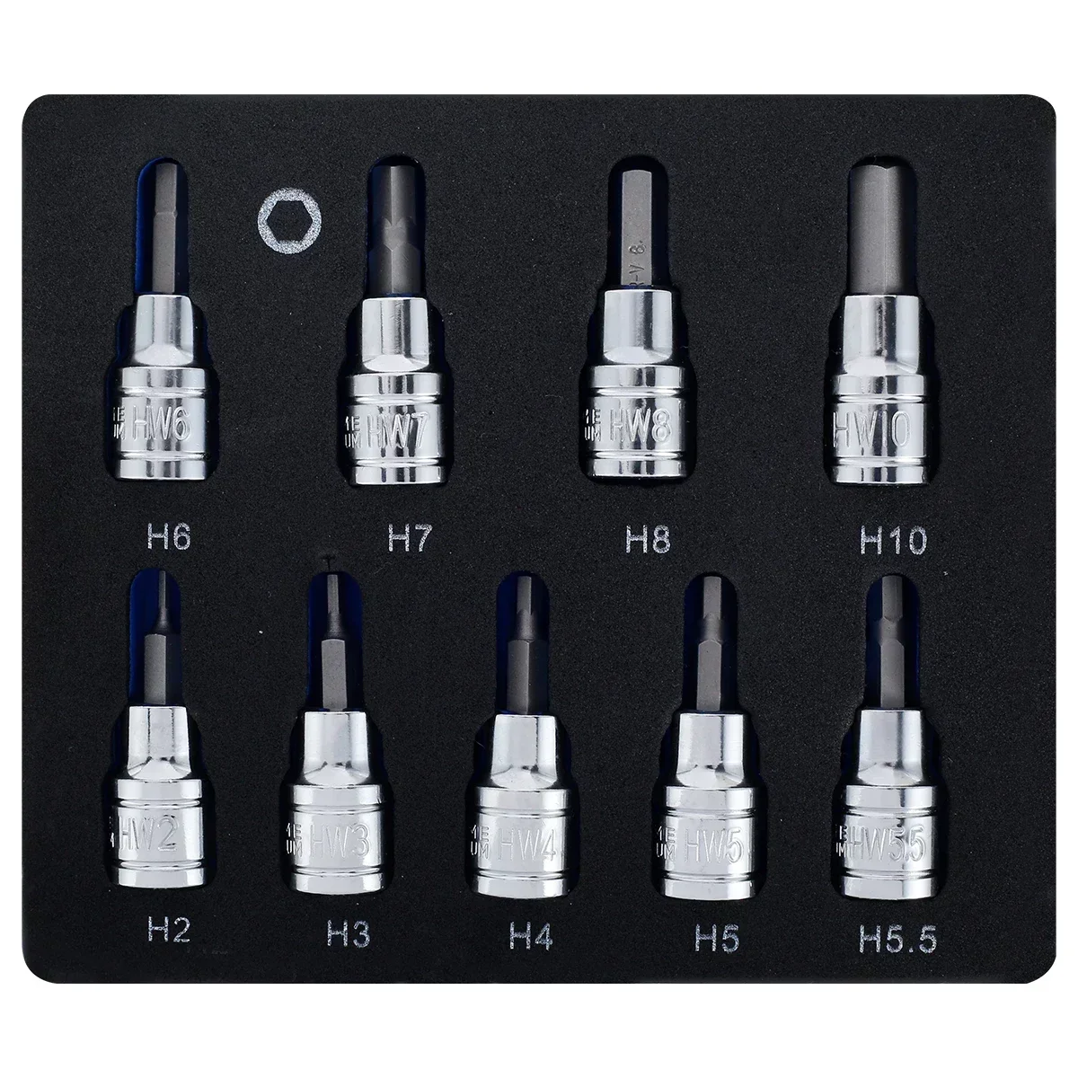 Ce kit comprend 9 modèles de douilles à clé Allen, allant de 2mm à 10mm. Ils s’adaptent à tous les cliquets d’entraînement de 3/8 pouces, barres d’extension, tiges, etc.