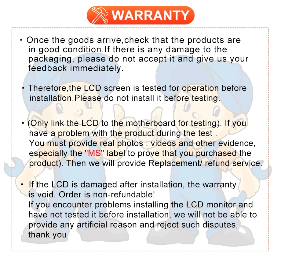Après avoir reçu le produit, veuillez connecter le câble à l’arrière de l’écran pour tester, et l’installer après que le test soit normal. Ne pas installer sans test. (S’il y a un problème avec le produit, veuillez nous contacter dès que possible, nous vous donnerons la meilleure solution)